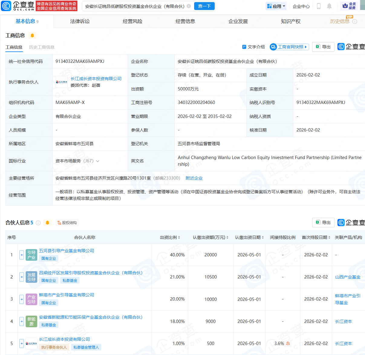 企查查APP显示,近日,安徽长证皖吕低碳股权投资基金合伙企业(有限合伙)成立,出资额5亿元,经营范围包含:以私募基金从事股权投资、投资管理、资产管理等活动。企查查股权穿透显示,该合伙企业由吕梁经开区发展引导股权投资基金合伙企业(有限合伙)、长江成长资本投资有限公司等共同持股。