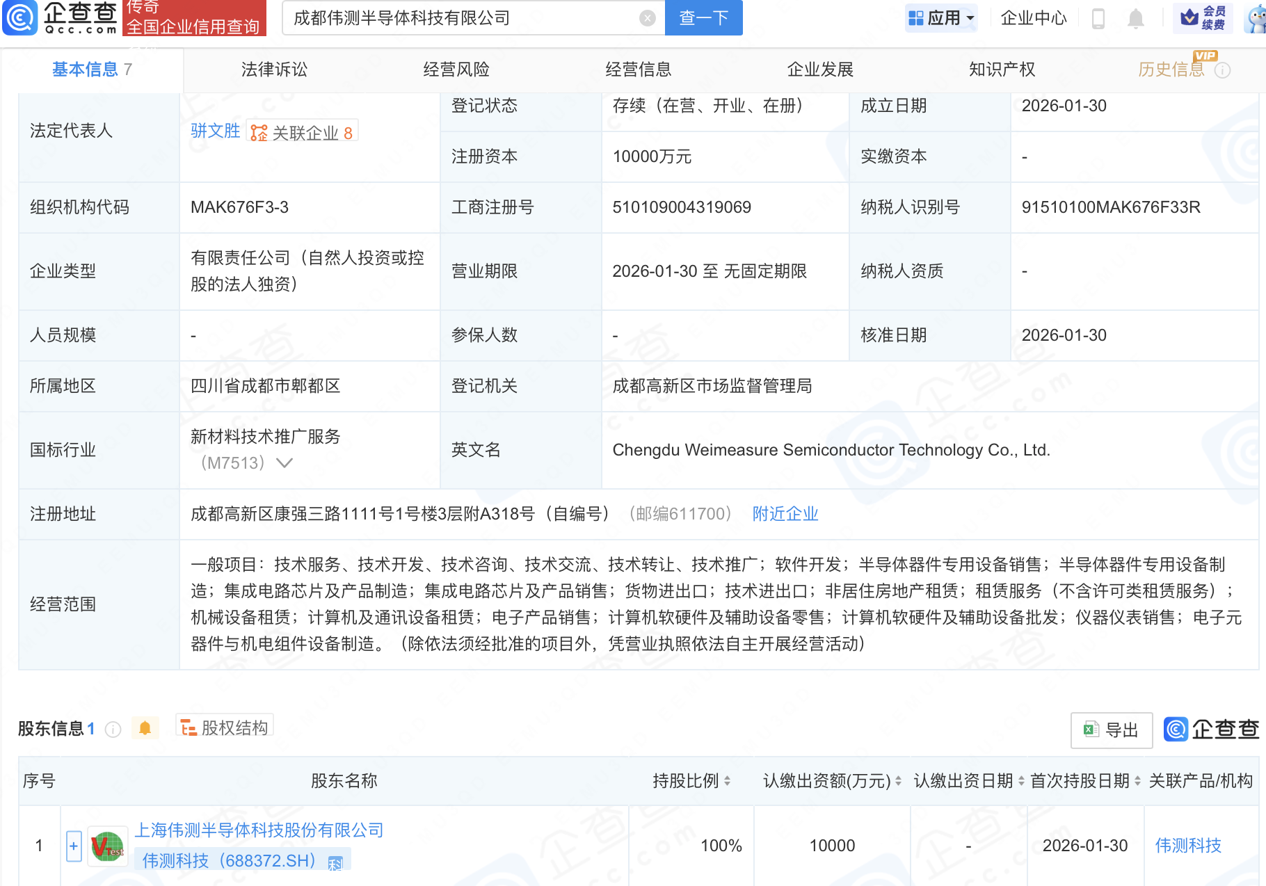 企查查APP显示,近日,成都伟测半导体科技有限公司成立,注册资本1亿元,经营范围包含:半导体器件专用设备销售;半导体器件专用设备制造;集成电路芯片及产品制造;集成电路芯片及产品销售等。企查查股权穿透显示,该公司由伟测科技(688372)全资持股。
