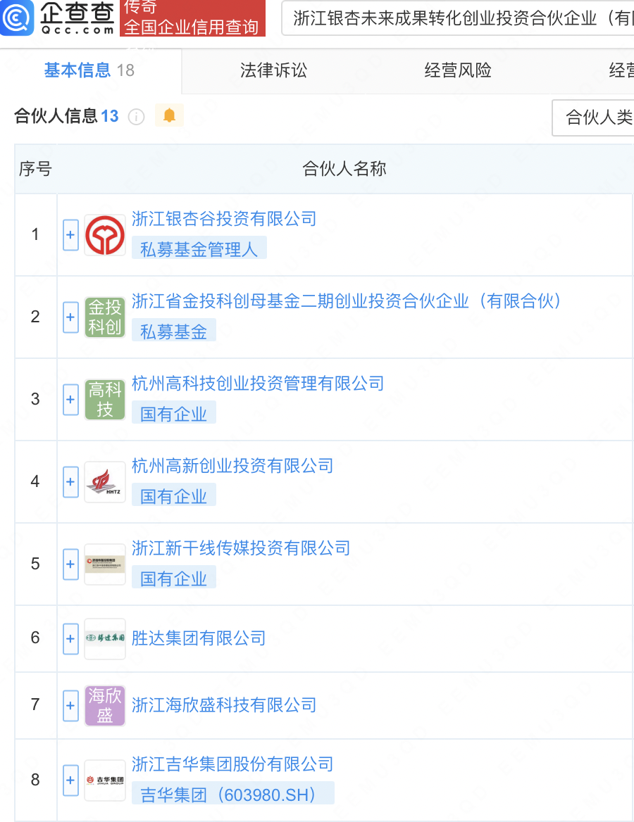 企查查APP显示,近日,浙江银杏未来成果转化创业投资合伙企业(有限合伙)成立,出资额约7.64亿元,经营范围包含:创业投资(限投资未上市企业);股权投资。企查查股权穿透显示,该企业由吉华集团(603980)等共同出资。