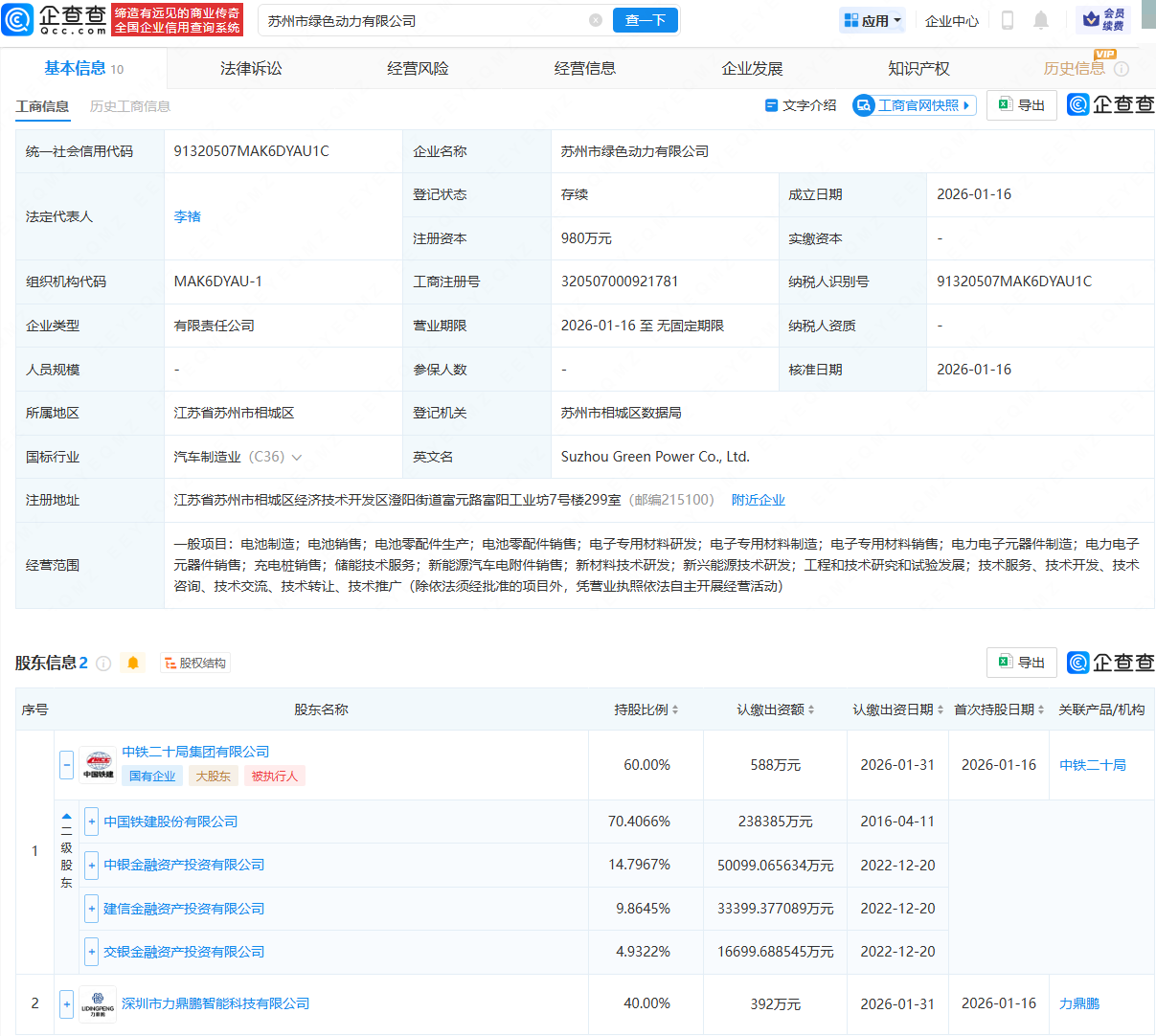 企查查APP显示,近日,苏州市绿色动力有限公司成立,法定代表人为李褚,经营范围包含:电池制造;电池零配件生产;电池零配件销售;电子专用材料研发;电子专用材料制造;电子专用材料销售等。企查查股权穿透显示,该公司由中国铁建(601186)旗下中铁二十局集团有限公司、深圳市力鼎鹏智能科技有限公司共同持股。
