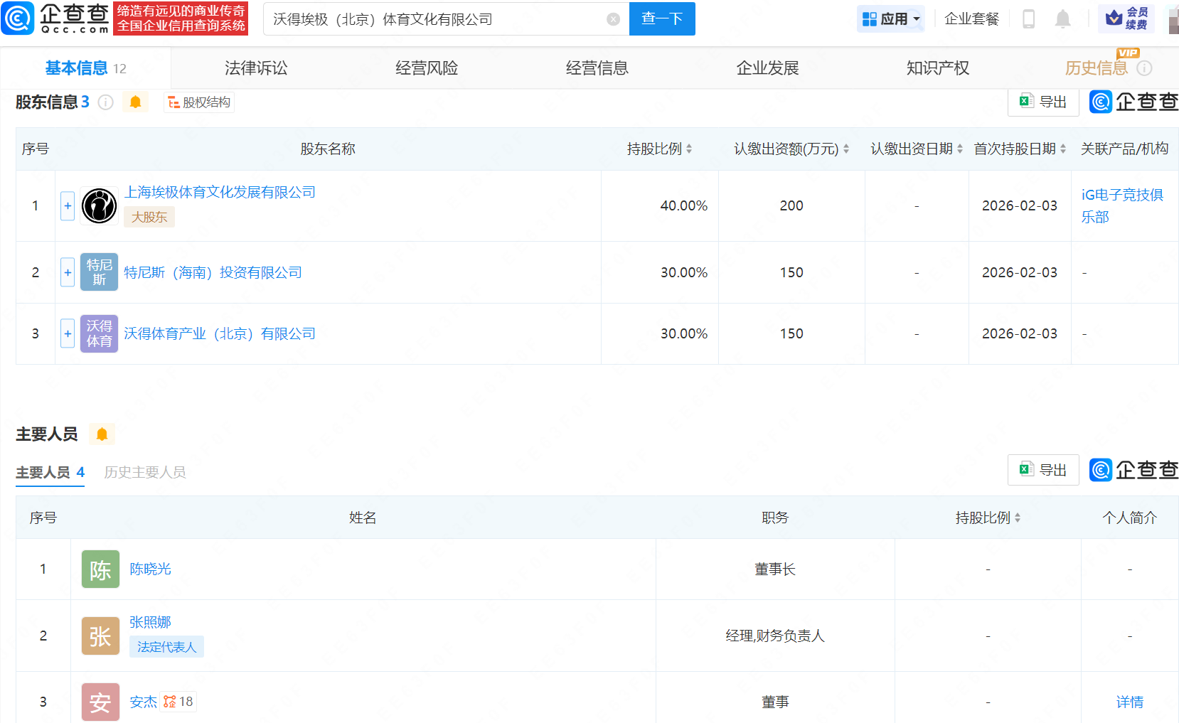 企查查APP显示,近日,沃得埃极(北京)体育文化有限公司成立,法定代表人为张照娜,注册资本500万元,经营范围包含体育赛事策划、体育竞赛组织、组织体育表演活动等。企查查股权穿透显示,该公司由IG电子竞技俱乐部关联公司上海埃极体育文化发展有限公司、特尼斯(海南)投资有限公司、沃得体育产业(北京)有限公司共同持股。