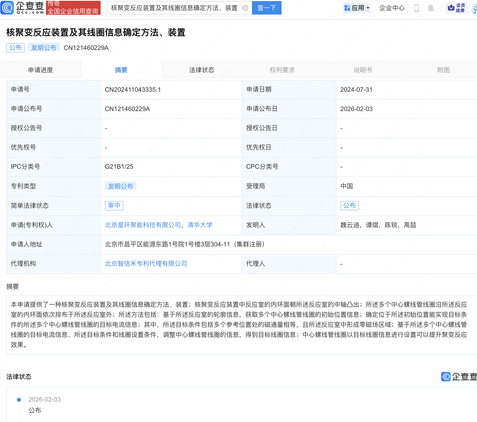企查查APP显示,近日,北京星环聚能科技有限公司、清华大学“核聚变反应装置及其线圈信息确定方法、装置”专利公布。企查查专利摘要显示,本申请提供了一种核聚变反应装置及其线圈信息确定方法、装置;核聚变反应装置中反应室的内环面朝所述反应室的中轴凸出;所述多个中心螺线管线圈沿所述反应室的内环面依次排布于所述反应室外;所述方法包括:基于所述反应室的轮廓信息,获取多个中心螺线管线圈的初始位置信息;确定位于所述初始位置能实现目标条件的所述多个中心螺线管线圈的目标电流信息;其中,所述目标条件包括多个参考位置处的磁通量相等,且所述反应室中形成零磁场区域;基于所述多个中心螺线管线圈的目标电流信息、所述目标条件和线圈设置条件,调整中心螺线管线圈的信息,得到目标线圈信息;中心螺线管线圈以目标线圈信息进行设置可以提升聚变反应效果。