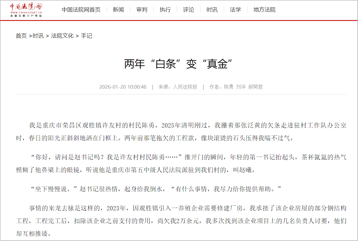 2025年清明刚过,重庆市荣昌区观胜镇许友村的村民陈勇攥着一张泛黄的欠条,走进了驻村工作队办公室。两年前,他为当地一家养殖企业修建厂房,工程完工后却因企业推诿,2万余元工程款迟迟未到账。这场“讨薪马拉松”在驻村第一书记赵曦的介入下,因企查查的精准数据支持迎来转机——从立案到执行仅用3个月,村民最终拿回血汗钱。