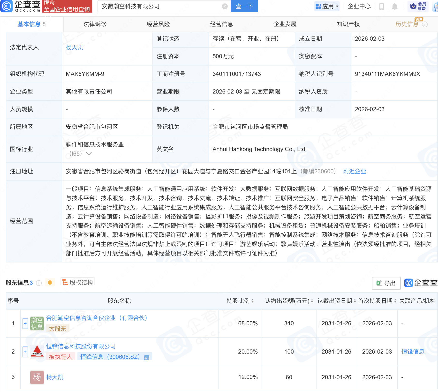 企查查APP显示,近日,安徽瀚空科技有限公司成立,经营范围包含:人工智能公共服务平台技术咨询服务;人工智能公共数据平台;航空商务服务;航空运营支持服务;航空运输设备销售等。企查查股权穿透显示,该公司由恒锋信息(300605)等共同持股。