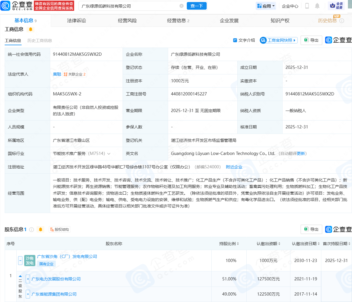 企查查APP显示,近日,广东绿源低碳科技有限公司成立,法定代表人为黄聪,注册资本为1000万元,经营范围包含:新兴能源技术研发;再生资源销售;节能管理服务;生物质燃料加工;生物化工产品技术研发等。企查查股权穿透显示,该公司由粤电力A(000539)旗下广东省沙角(C厂)发电有限公司全资持股。