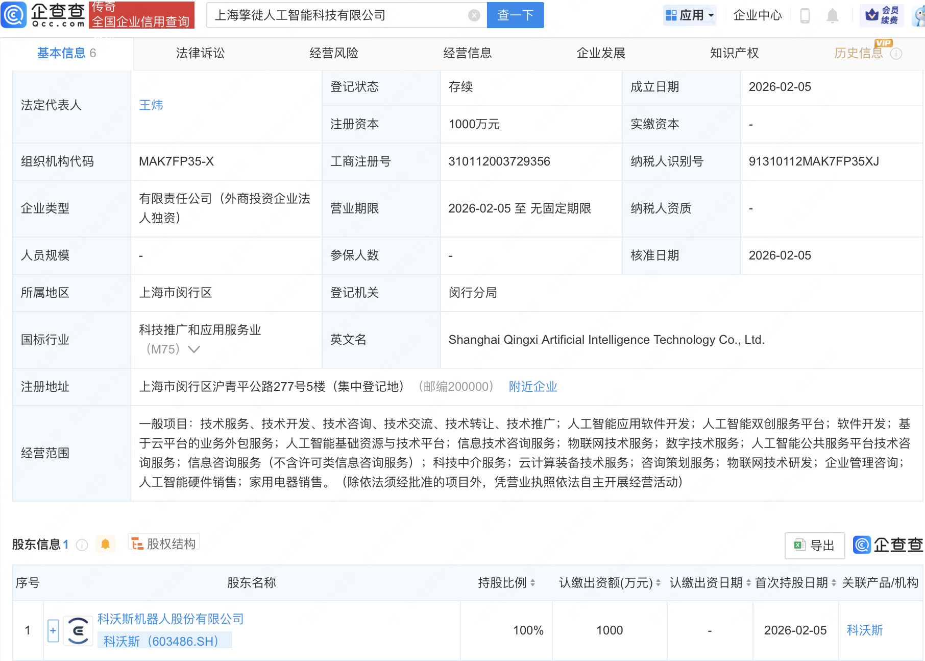 企查查APP显示,近日,上海擎徙人工智能科技有限公司成立,注册资本1000万元,经营范围包含:人工智能应用软件开发;人工智能双创服务平台;物联网技术服务;数字技术服务等。企查查股权穿透显示,该公司由科沃斯(603486)全资持股。