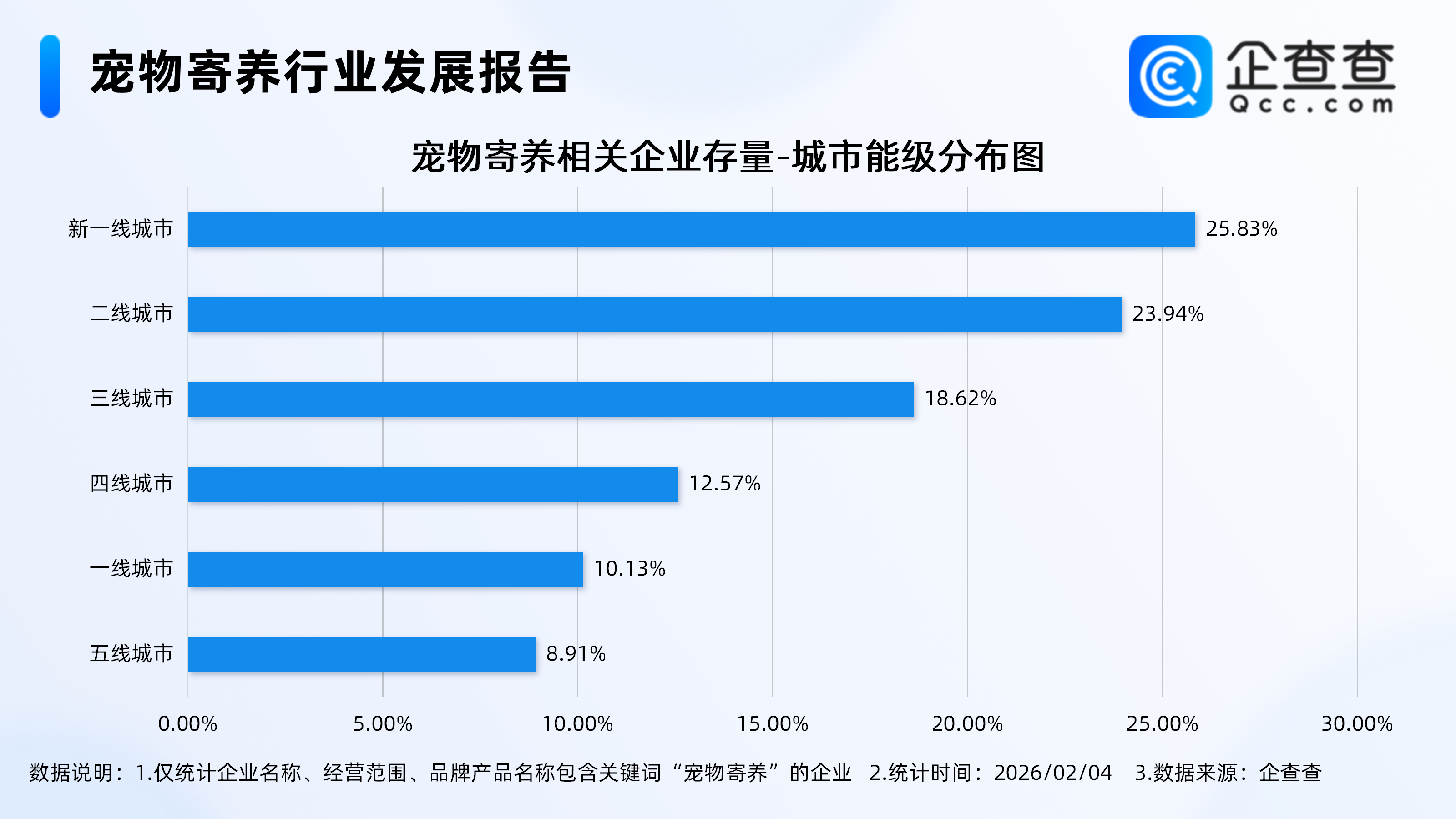 企查查数据显示,从城市能级分布来看,分布在新一线城市的宠物寄养相关企业最多,占比25.83%。其次,分布在二线城市、三线城市的相关企业分别占比23.94%、18.62%。