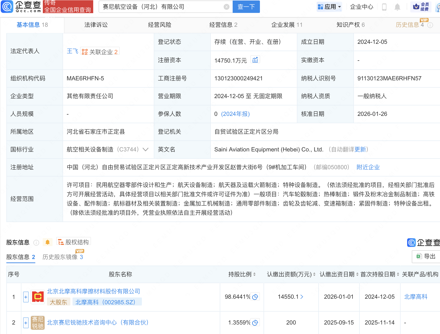 企查查APP显示,近日,赛尼航空设备(河北)有限公司发生工商变更,北摩高科(002985)持股比例由80%上升至98.64%,同时注册资本由1000万元增至1.48亿元。企查查信息显示,该公司成立于2024年,经营范围包含:民用航空器零部件设计和生产;航天设备制造;航天器及运载火箭制造;特种设备制造等。
