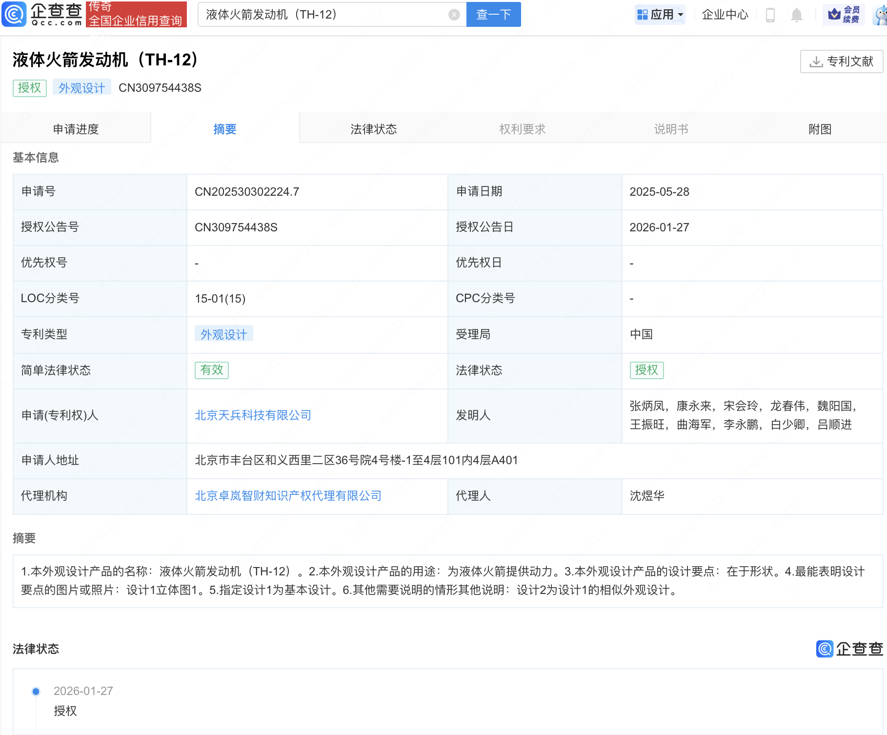企查查APP显示,近日,江苏天兵航天科技股份有限公司全资子公司北京天兵科技有限公司申请的“液体火箭发动机(TH-12)”外观设计专利获授权。企查查专利摘要显示,本外观设计产品的用途在于为液体火箭提供动力,其设计要点在于形状。