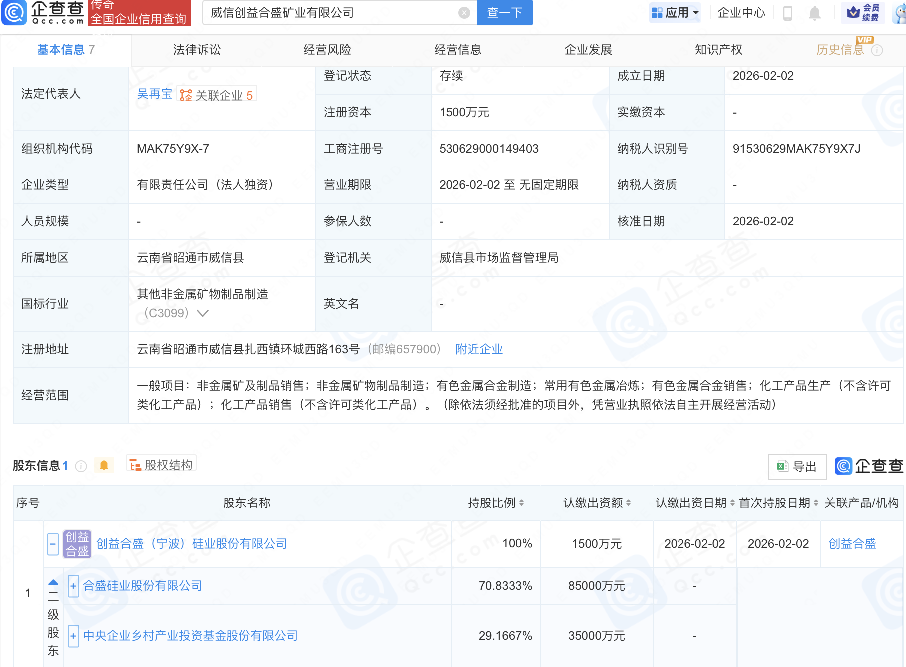 企查查APP显示,近日,威信创益合盛矿业有限公司成立,经营范围包含:非金属矿及制品销售;非金属矿物制品制造;有色金属合金制造;常用有色金属冶炼等。企查查股权穿透显示,该公司由合盛硅业(603260)旗下创益合盛(宁波)硅业股份有限公司全资持股。