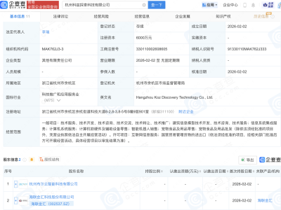 企查查APP显示,近日,宁波市晶映商显科技有限公司成立,注册资本2000万元,经营范围包含:半导体照明器件制造;半导体照明器件销售;半导体器件专用设备制造;半导体器件专用设备销售等。企查查股权穿透显示,该公司由GQY视讯(300076)等共同持股。