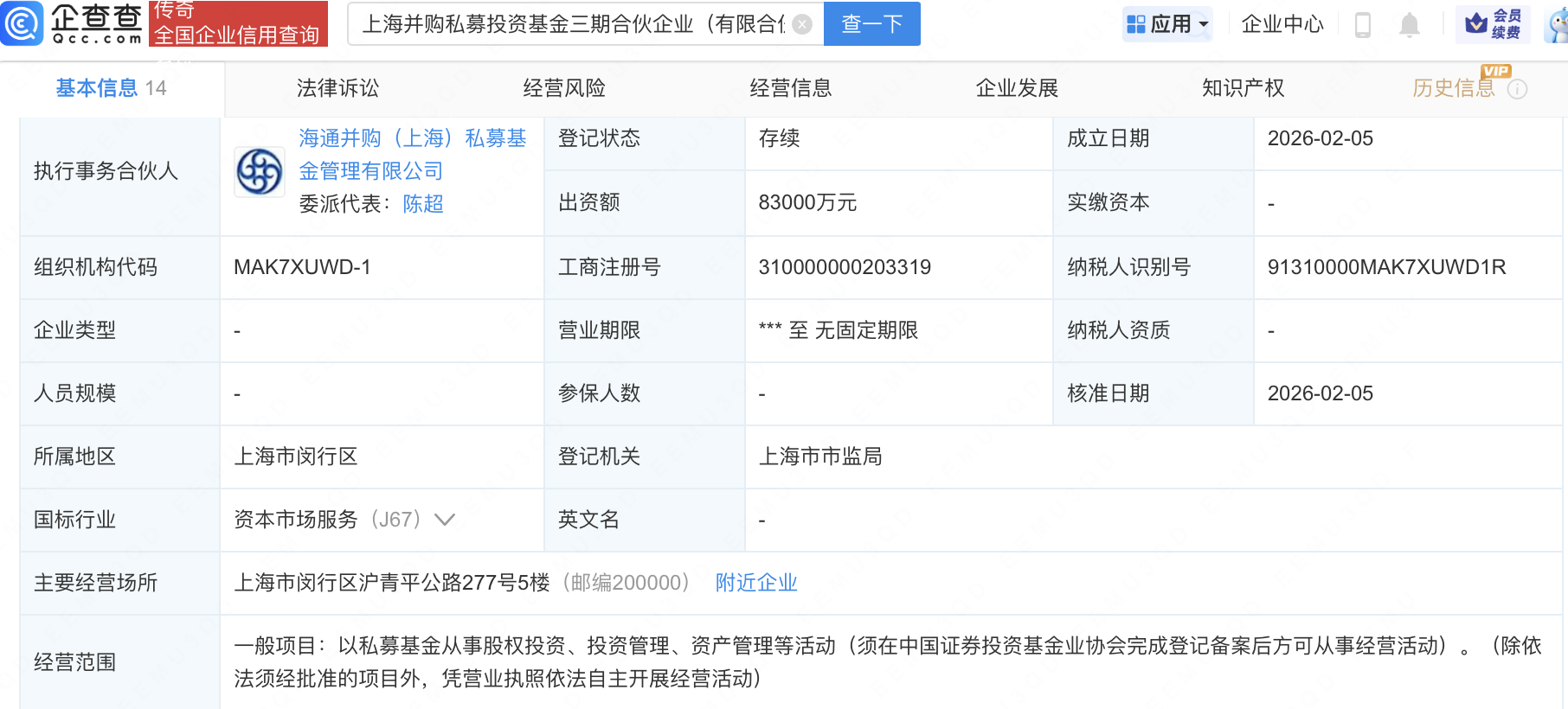 企查查APP显示,近日,上海并购私募投资基金三期合伙企业(有限合伙)成立,出资额8.3亿元,经营范围包含:以私募基金从事股权投资、投资管理、资产管理等活动。企查查股权穿透显示,该企业由长芯博创(300548)、长飞光纤(601869)全资子公司武汉市长飞资本管理有限责任公司等共同出资。