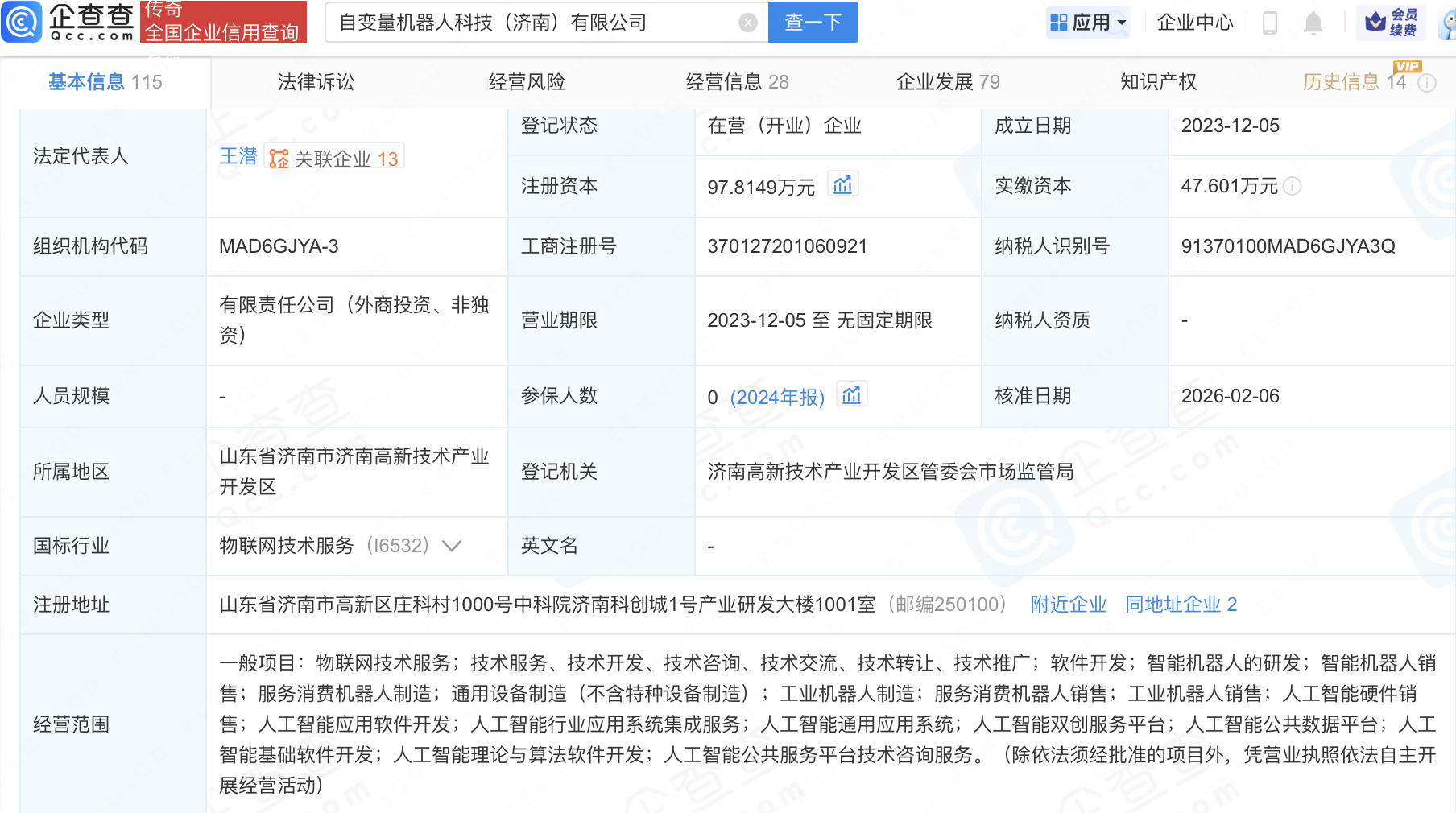 企查查APP显示,近日,自变量机器人科技(济南)有限公司发生工商变更,新增浙江阿里巴巴云计算有限公司等为股东,同时注册资本增至97.81万元。企查查信息显示,该公司成立于2023年,法定代表人为王潜,经营范围包含:智能机器人的研发;智能机器人销售;人工智能双创服务平台;人工智能公共数据平台等。