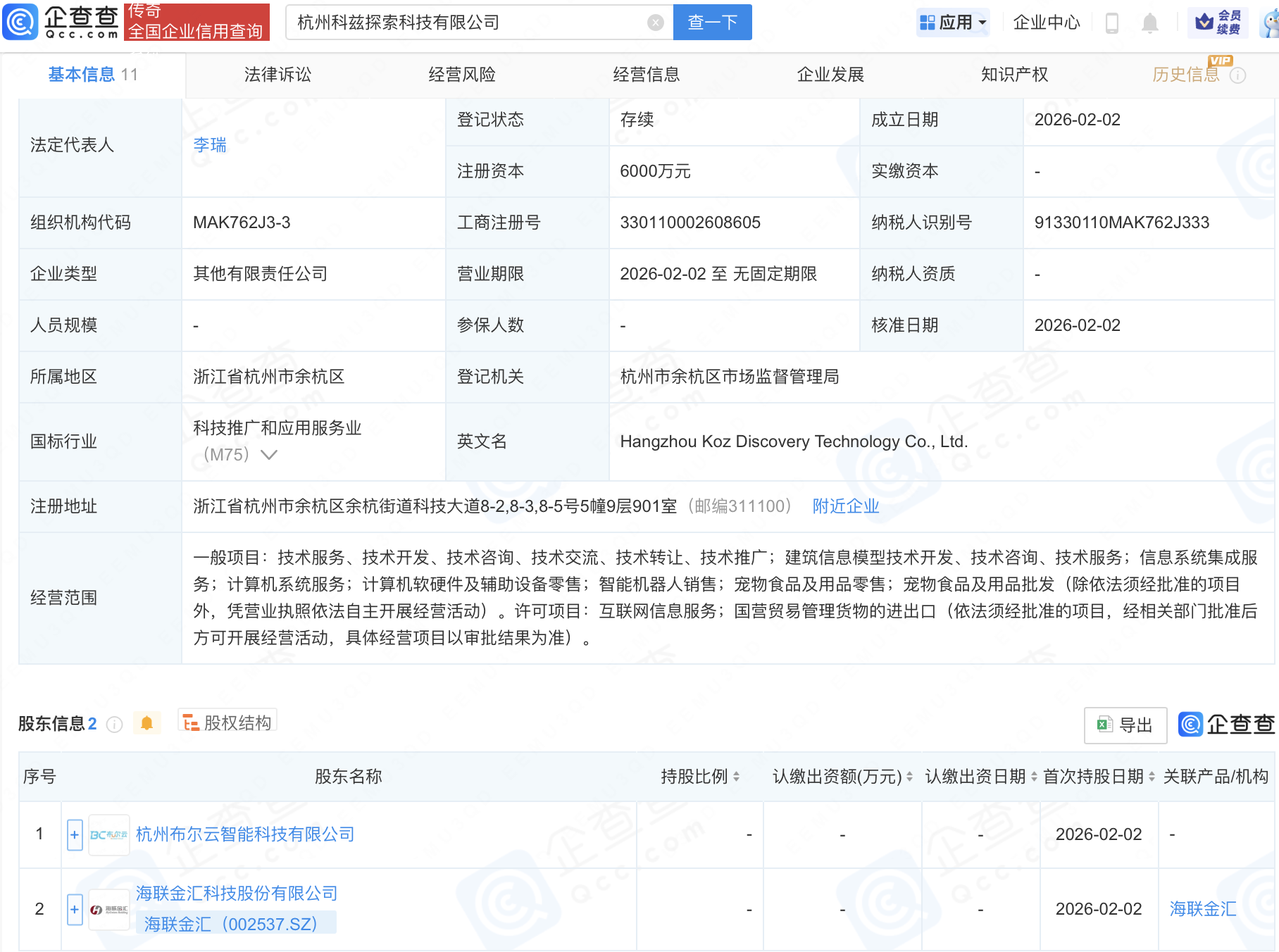 企查查APP显示,近日,杭州科兹探索科技有限公司成立,注册资本6000万元,经营范围包含:信息系统集成服务;计算机系统服务;计算机软硬件及辅助设备零售;智能机器人销售等。企查查股权穿透显示,该公司由海联金汇(002537)等共同持股。