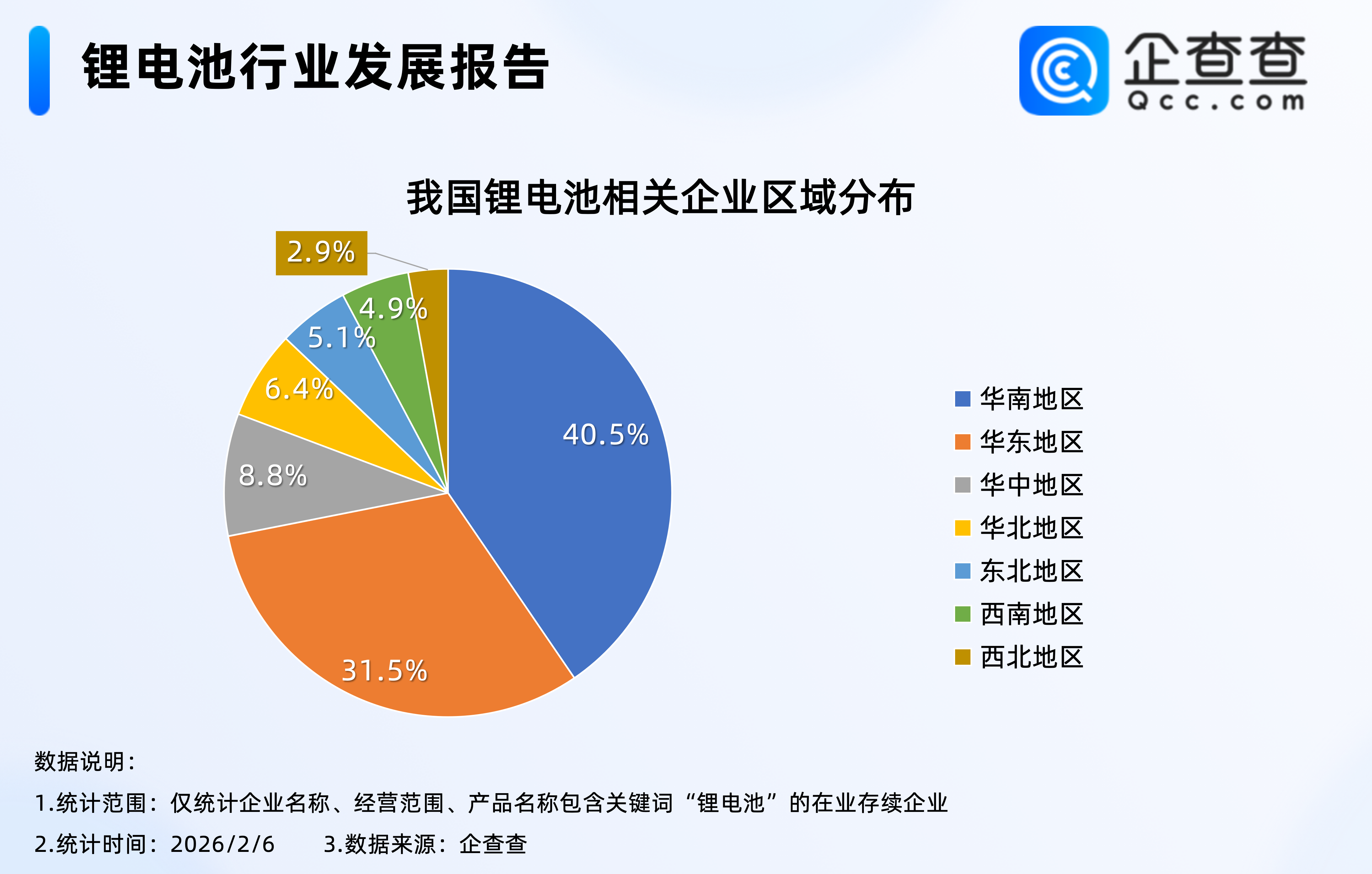 企查查数据显示,2025年全年,我国累计注册452家锂电池相关企业,相比2024年同期增加22.8%。截至2026年2月6日,我国现存1.7万家锂电池相关企业,从成立年限上看,我国锂电池领域以老牌企业为主,成立5至10年之间的企业占比62.5%;区域分布上,华南地区现存锂电池相关企业最多,占比超四成,其次是华东地区,占比31.5%。