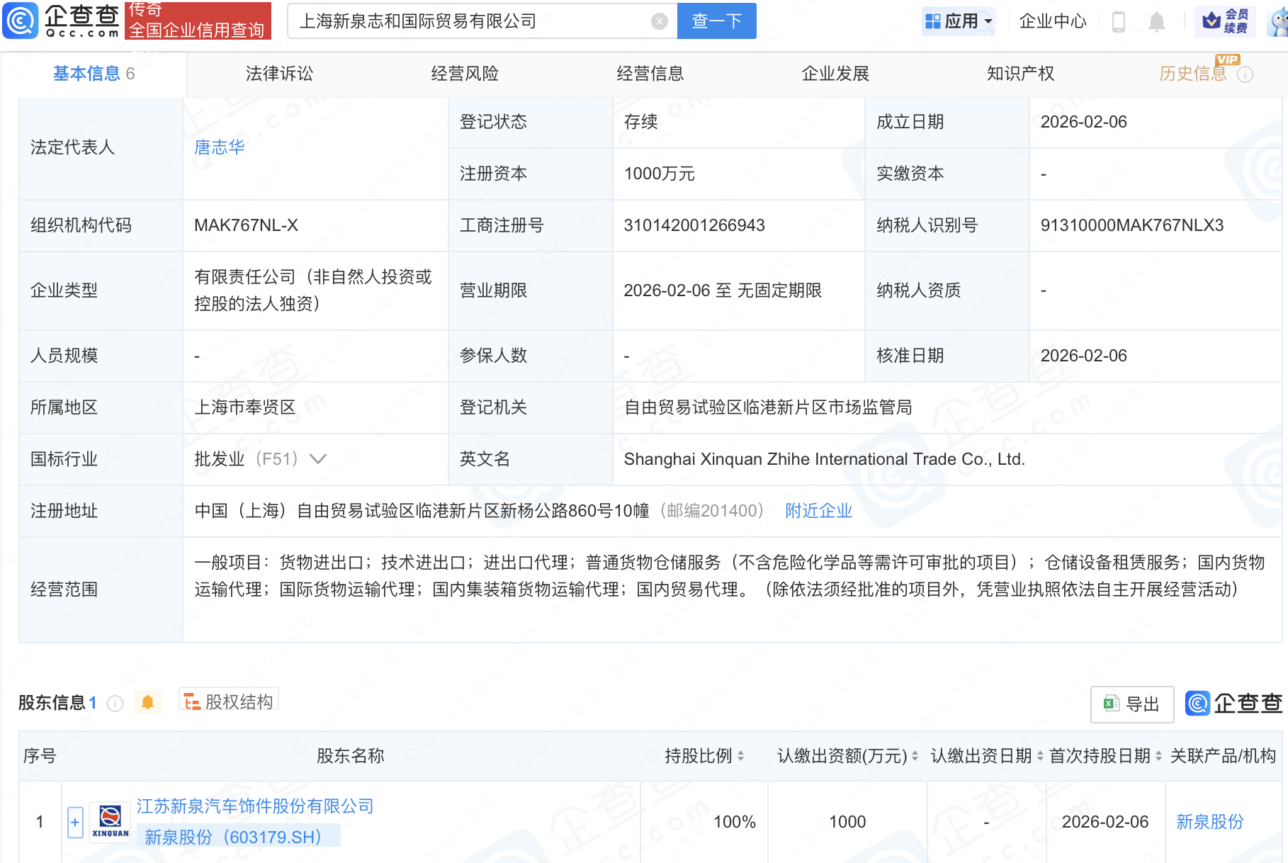 企查查APP显示,近日,上海新泉志和国际贸易有限公司成立,注册资本1000万元,经营范围包含:仓储设备租赁服务;国内货物运输代理;国际货物运输代理;国内集装箱货物运输代理等。企查查股权穿透显示,该公司由新泉股份(603179)全资持股。