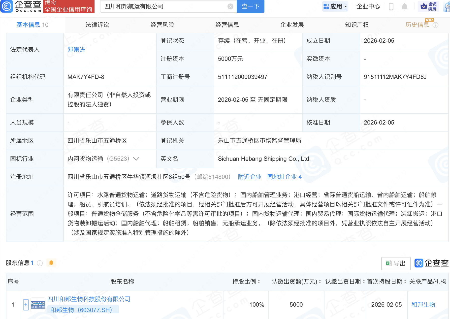企查查APP显示,近日,四川和邦航运有限公司成立,注册资本5000万元,经营范围包含:国内贸易代理;国际货物运输代理;装卸搬运;港口货物装卸搬运活动等。企查查股权穿透显示,该公司由和邦生物(603077)全资持股。