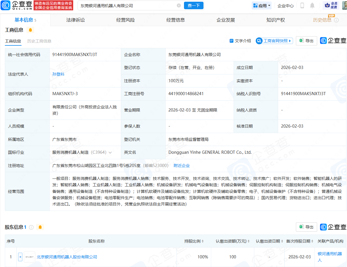 企查查APP显示,近日,东莞银河通用机器人有限公司成立,法定代表人为孙登科,经营范围包含:服务消费机器人制造;服务消费机器人销售;智能机器人的研发;智能机器人销售;工业机器人制造等。企查查股权穿透显示,该公司由北京银河通用机器人股份有限公司全资持股。