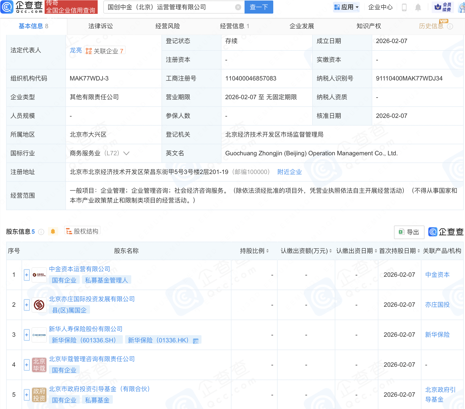 企查查APP显示,近日,国创中金(北京)运营管理有限公司成立,经营范围包含:企业管理;企业管理咨询;社会经济咨询服务。企查查股权穿透显示,该公司由中金资本运营有限公司、北京亦庄国际投资发展有限公司、新华保险(601336)、北京市政府投资引导基金(有限合伙)等共同出资。