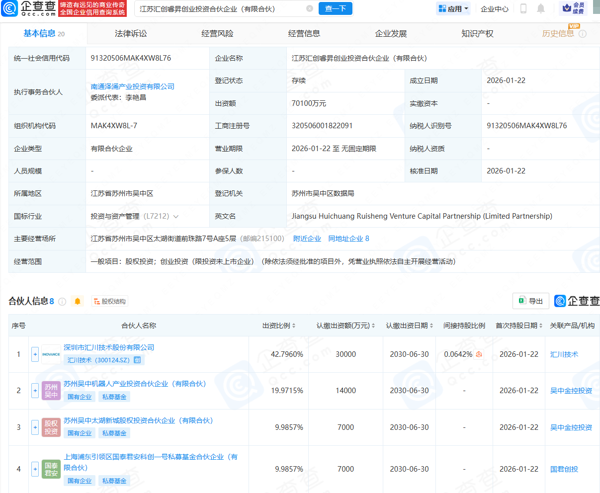企查查APP显示,近日,江苏汇创睿昇创业投资合伙企业(有限合伙)成立,出资额约7亿元,经营范围包含:股权投资;创业投资。企查查股权穿透显示,该合伙企业由汇川技术(300124)、苏州吴中机器人产业投资合伙企业(有限合伙)等共同持股。
