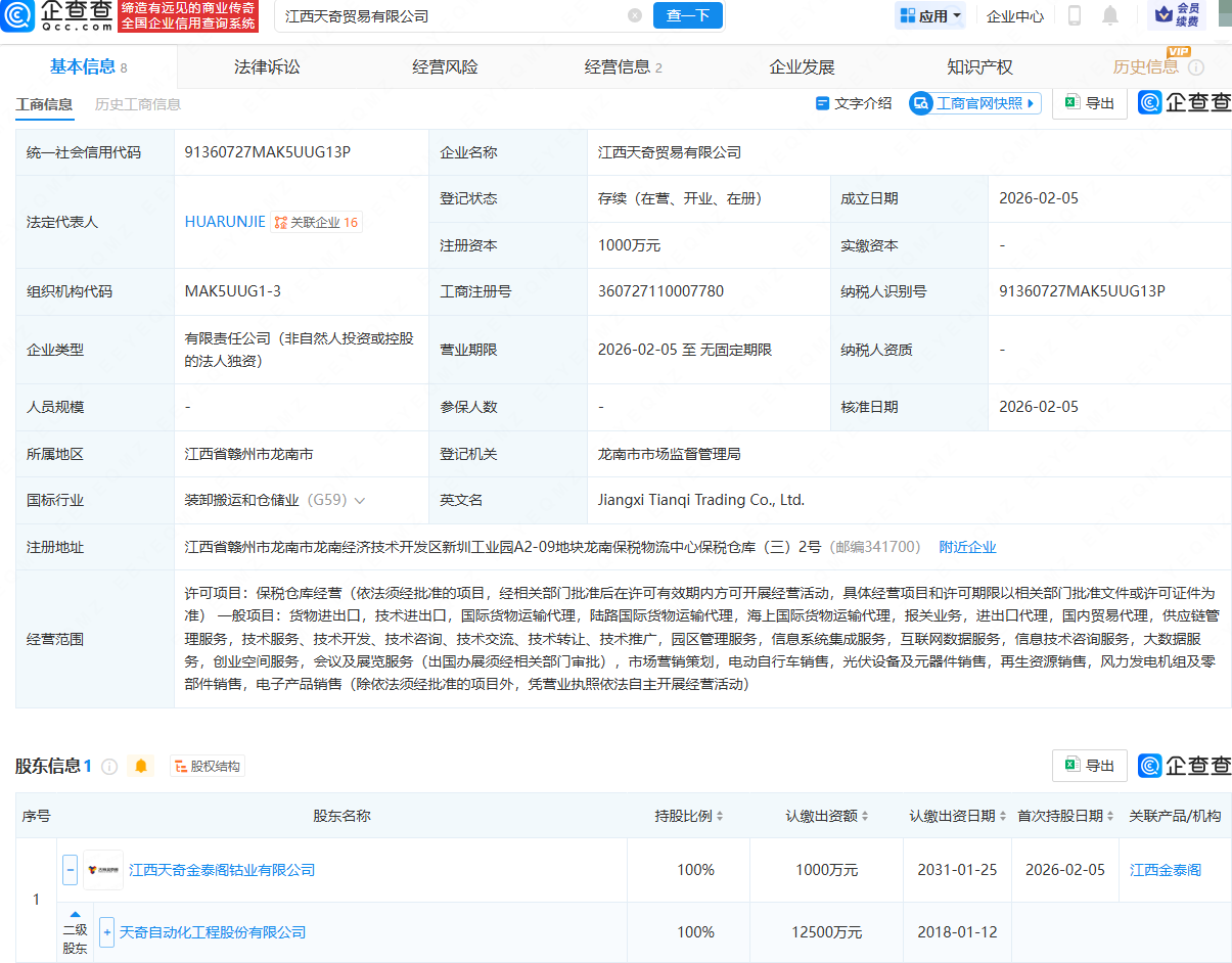 企查查APP显示,近日,江西天奇贸易有限公司成立,法定代表人为HUARUNJIE,注册资本为1000万元,经营范围包含:保税仓库经营,国际货物运输代理,陆路国际货物运输代理,海上国际货物运输代理,供应链管理服务等。企查查股权穿透显示,该公司由天奇股份(002009)间接全资持股。