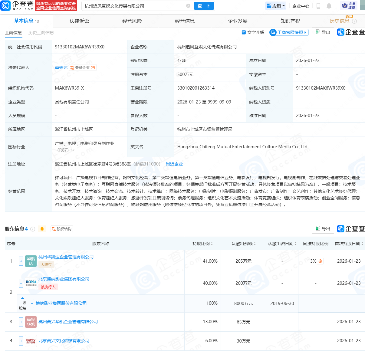 企查查APP显示,近日,杭州追风互娱文化传媒有限公司成立,法定代表人为虞竣达,经营范围包含:广播电视节目制作经营;网络文化经营;电影制片;电影摄制服务;广告发布;广告制作等。企查查股权穿透显示,该公司由杭州华凯达企业管理有限公司、博纳影业(001330)全资子公司北京博纳影业集团有限公司等共同持股。