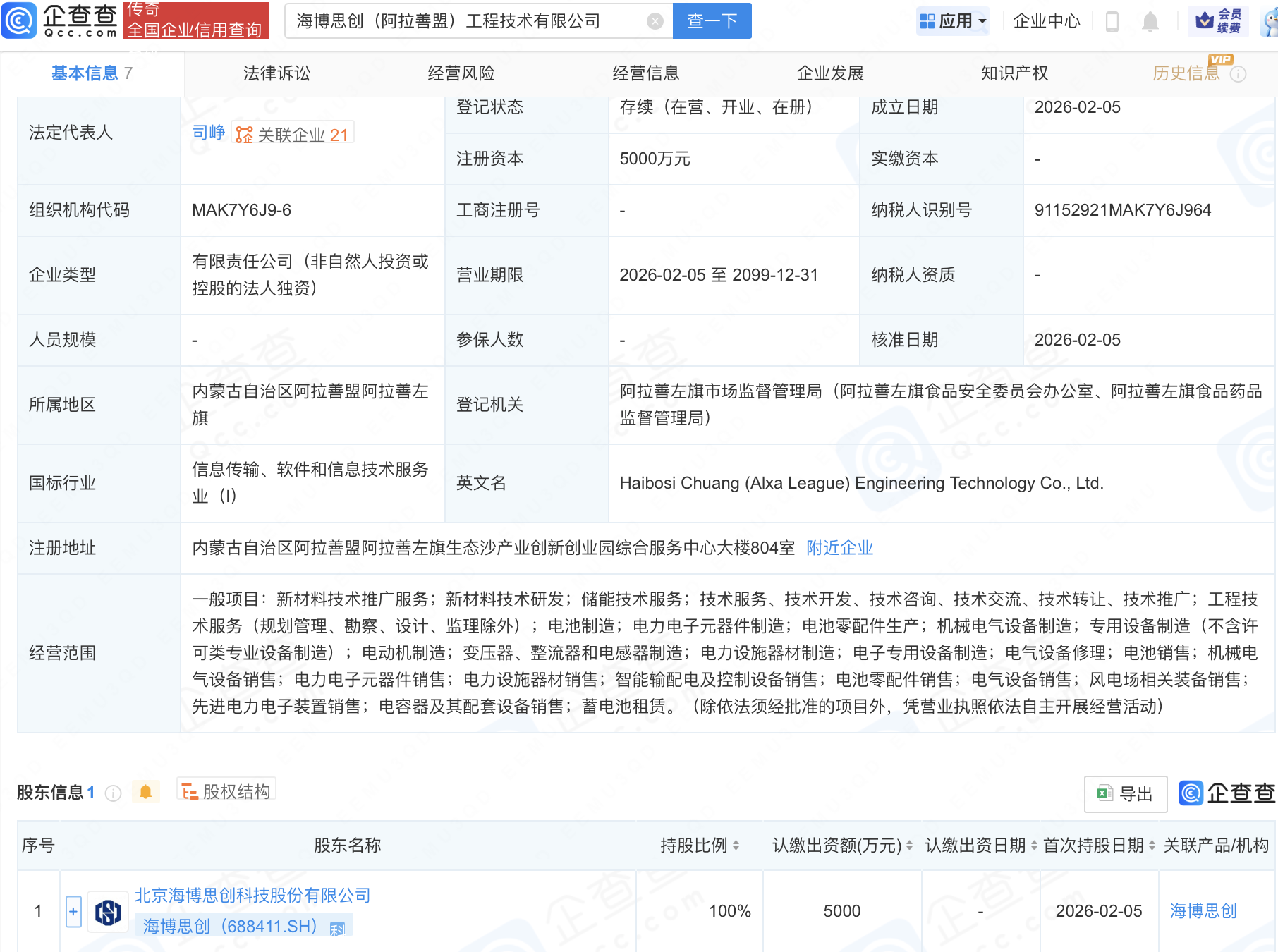 企查查APP显示,近日,海博思创(阿拉善盟)工程技术有限公司成立,注册资本5000万元,经营范围包含:风电场相关装备销售;先进电力电子装置销售;电容器及其配套设备销售;蓄电池租赁等。企查查股权穿透显示,该公司由海博思创(688411)全资持股。