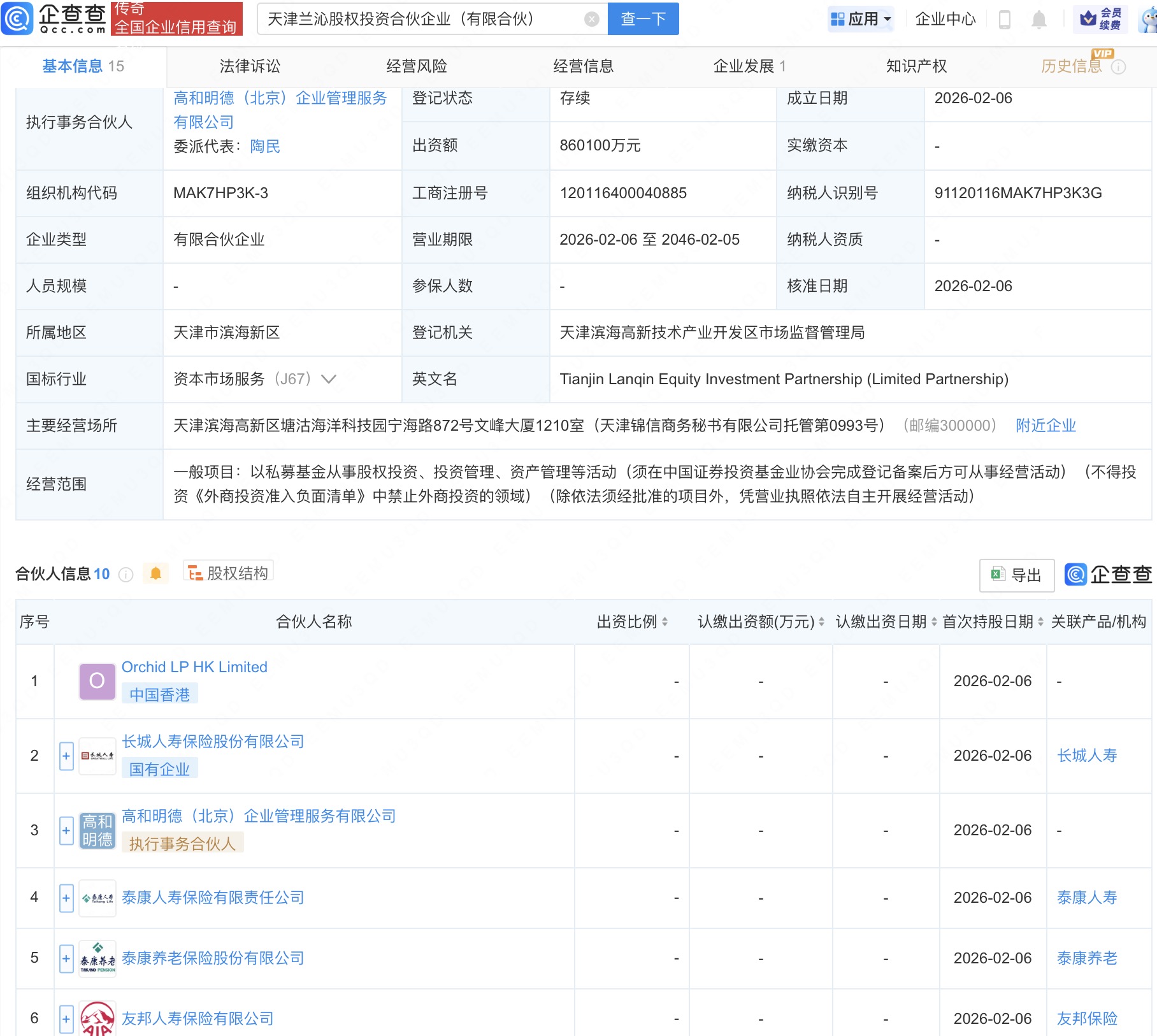 企查查APP显示,近日,天津兰沁股权投资合伙企业(有限合伙)成立,出资额86.01亿元,经营范围包含:以私募基金从事股权投资、投资管理、资产管理等活动。企查查股权穿透显示,该企业由泰康人寿保险有限责任公司、长城人寿保险股份有限公司、友邦人寿保险有限公司等共同出资。