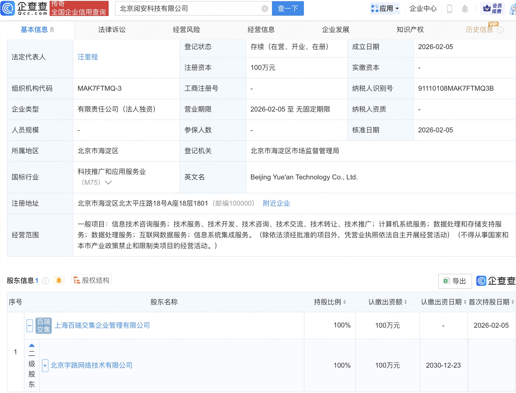 企查查APP显示,近日,北京阅安科技有限公司成立,法定代表人为汪里程,经营范围含信息技术咨询服务、计算机系统服务、数据处理和存储支持服务、数据处理服务、互联网数据服务等。企查查股权穿透显示,该公司由北京字跳网络技术有限公司间接全资持股。