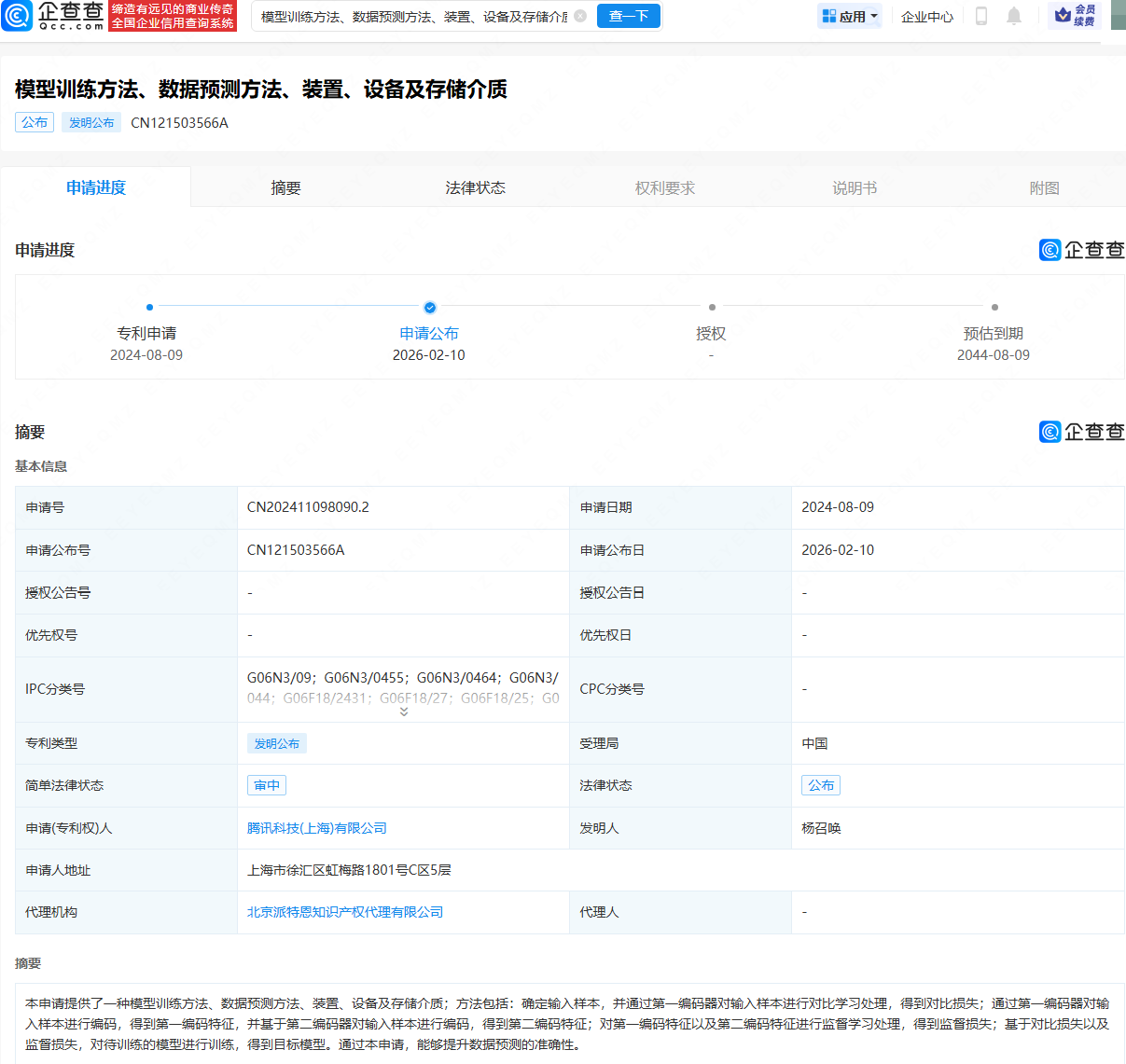 企查查APP显示,近日,腾讯科技(上海)有限公司申请公布“模型训练方法、数据预测方法、装置、设备及存储介质”专利。