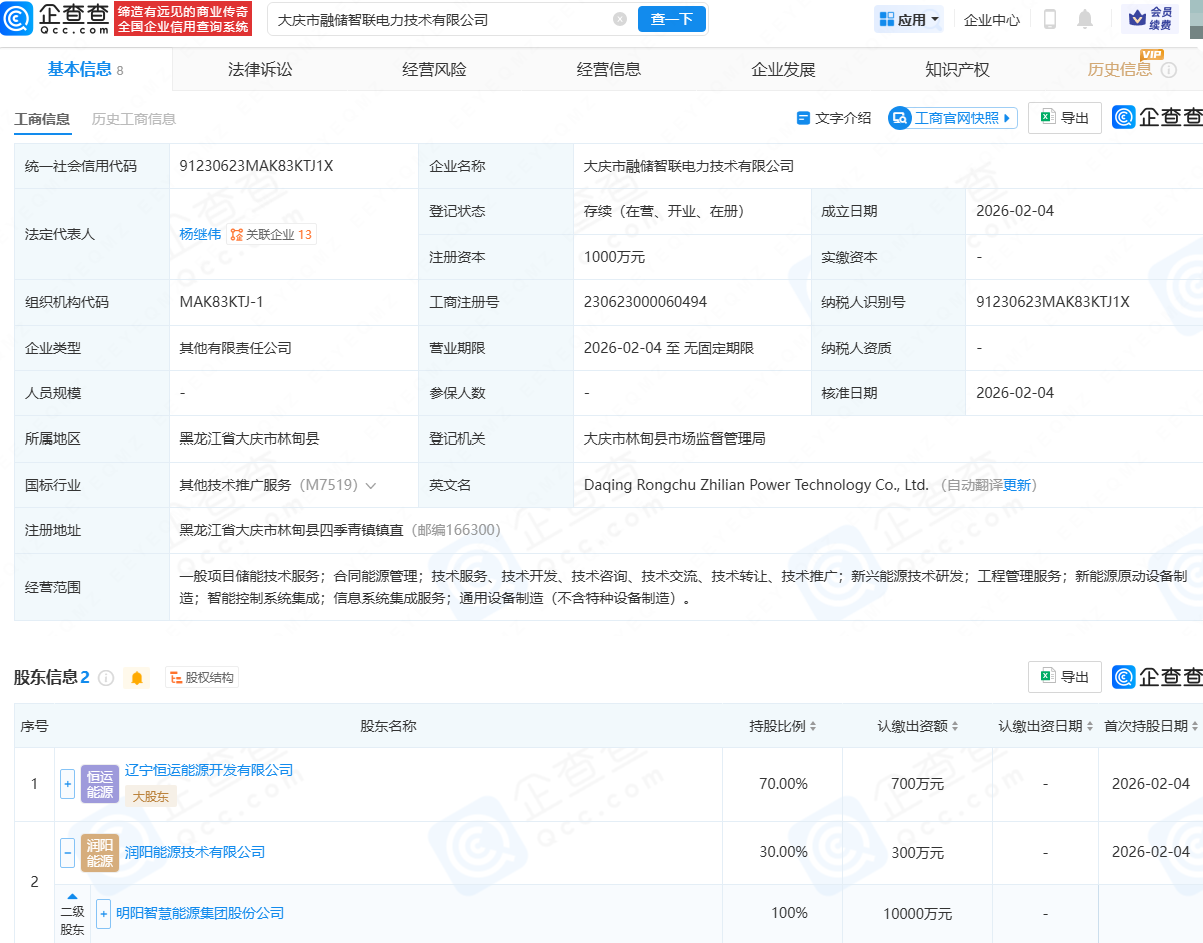企查查APP显示,近日,大庆市融储智联电力技术有限公司成立,法定代表人为杨继伟,注册资本为1000万元,经营范围包含:储能技术服务;合同能源管理;工程管理服务;新能源原动设备制造;智能控制系统集成等。企查查股权穿透显示,该公司由辽宁恒运能源开发有限公司、明阳智能(601615)旗下润阳能源技术有限公司共同持股。