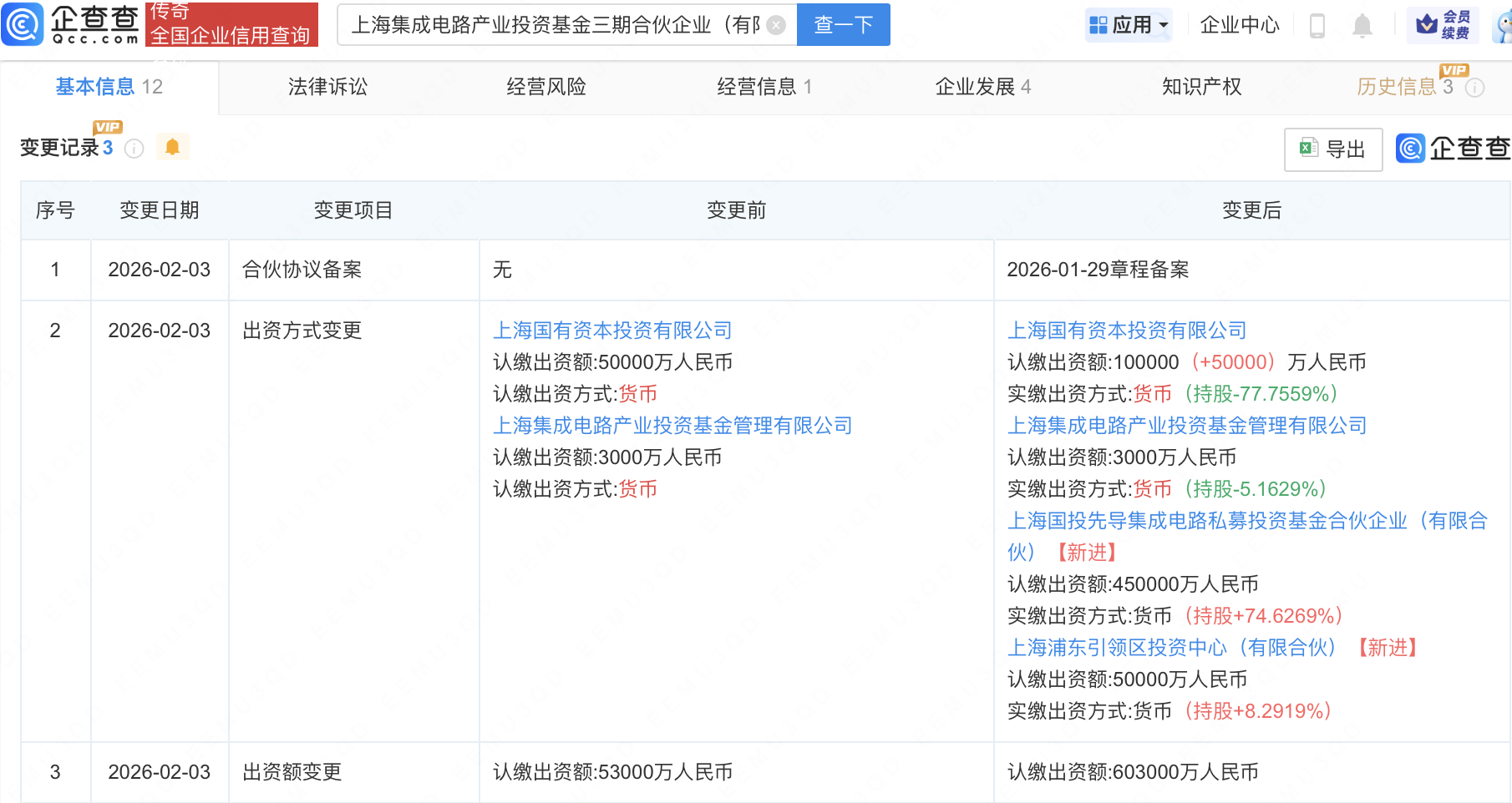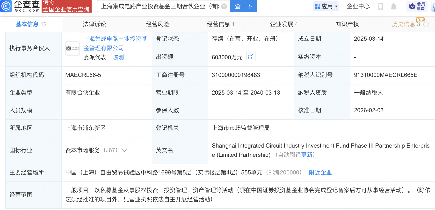 企查查APP显示,近日,上海集成电路产业投资基金三期合伙企业(有限合伙) 发生工商变更,新增上海国投先导集成电路私募投资基金合伙企业(有限合伙)等为合伙人,同时出资额由5.3亿元增至60.3亿元。企查查信息显示,该企业成立于2025年3月,经营范围包含:以私募基金从事股权投资、投资管理、资产管理等活动。