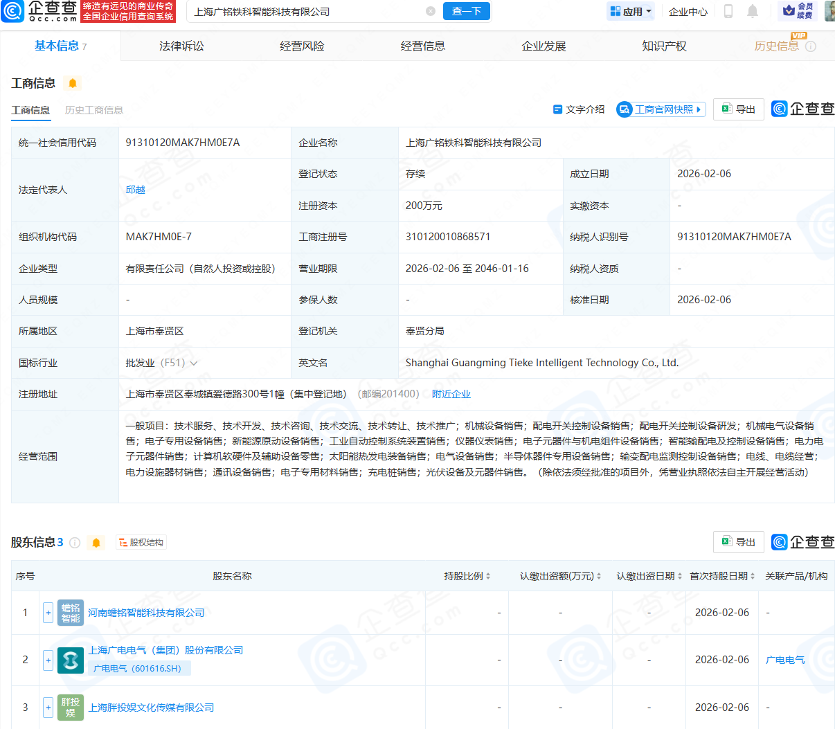 企查查APP显示,近日,上海广铭铁科智能科技有限公司成立,法定代表人为邱越,经营范围包含:配电开关控制设备销售;机械电气设备销售;电子专用设备销售;新能源原动设备销售;电气设备销售等。企查查股权穿透显示,该公司由河南蟾铭智能科技有限公司、广电电气(601616)等共同持股。