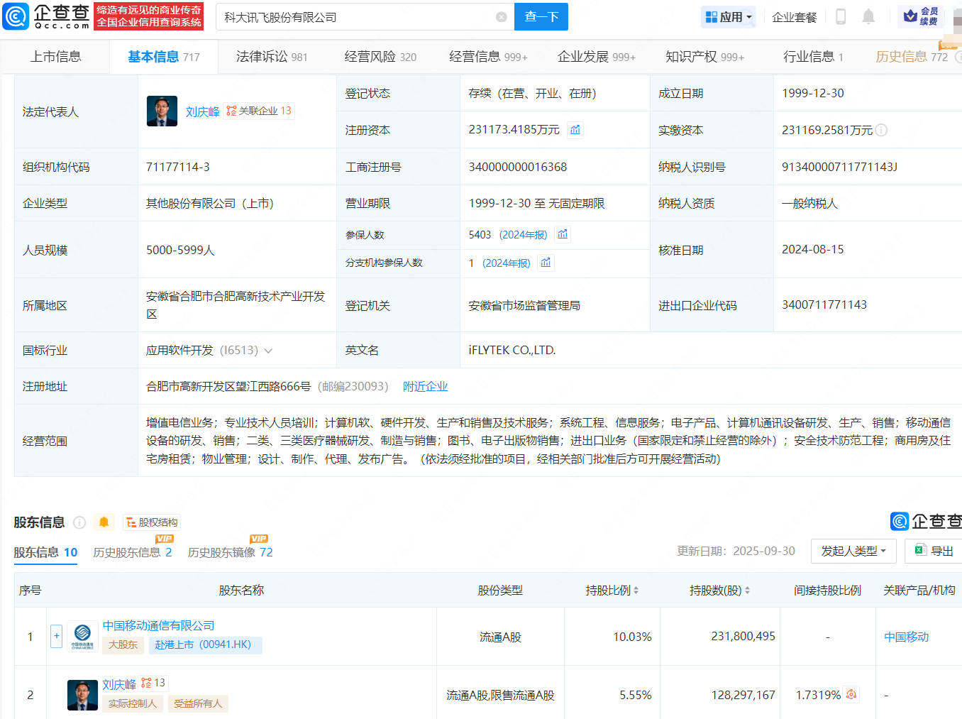 企查查APP显示,近日,科大讯飞(002230)申请注册一枚“超级制图”商标,国际分类为科学仪器,当前商标状态为注册申请中。该公司成立于1999年12月,法定代表人为刘庆峰,注册资本约23.1亿元,经营范围包含增值电信业务、专业技术人员培训、系统工程、信息服务等。企查查股权穿透显示,该公司由中国移动通信有限公司、刘庆峰等共同持股。