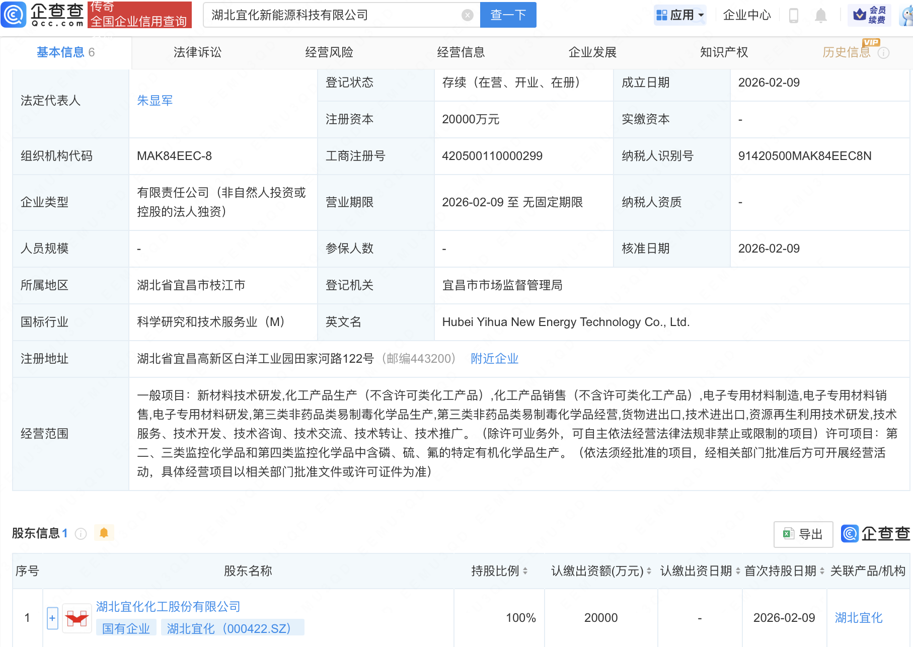 企查查APP显示,近日,湖北宜化新能源科技有限公司成立,注册资本2亿元,经营范围包含:电子专用材料制造;电子专用材料销售;电子专用材料研发;第三类非药品类易制毒化学品生产等。企查查股权穿透显示,该公司由湖北宜化(000422)全资持股。