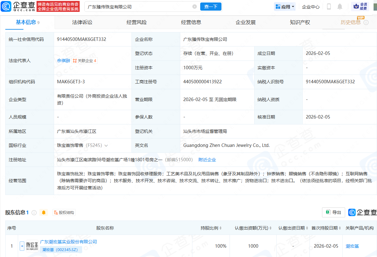 企查查APP显示,近日,广东臻传珠宝有限公司成立,法定代表人为佘祺翀,注册资本为1000万元,经营范围包含:珠宝首饰批发;珠宝首饰零售;珠宝首饰回收修理服务;钟表销售等。企查查股权穿透显示,该公司由潮宏基(002345)全资持股。