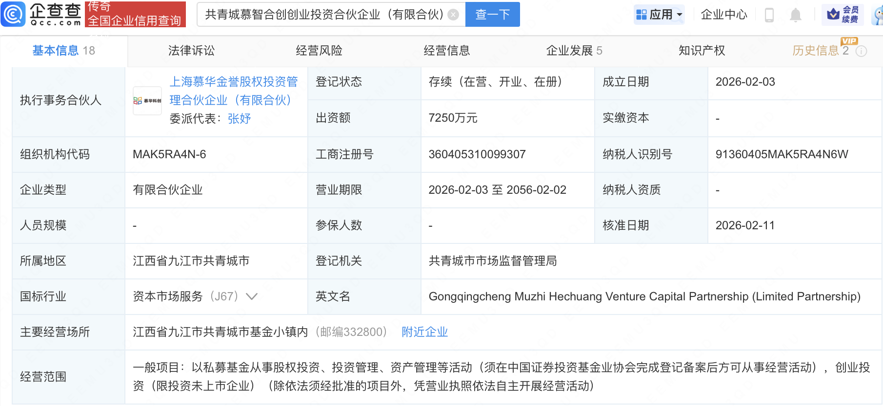 企查查APP显示,近日,共青城慕智合创创业投资合伙企业(有限合伙)发生工商变更,新增智元机器人关联公司智元创新(上海)科技股份有限公司、大洋电机(002249)、同星科技(301252)、智明达(688636)等为合伙人。企查查信息显示,该企业成立于2026年2月,经营范围包含:以私募基金从事股权投资、投资管理、资产管理等活动。