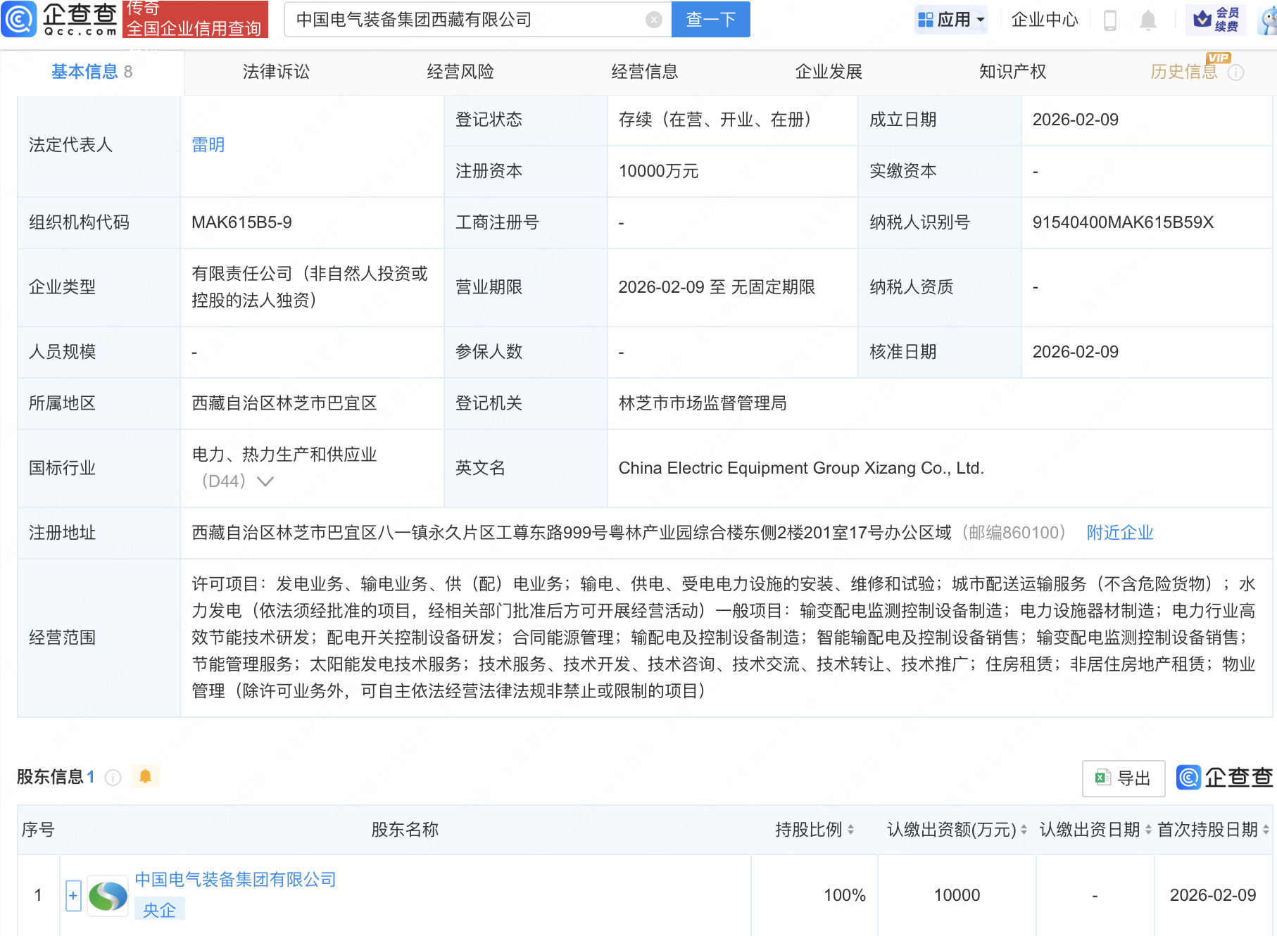 企查查APP显示,近日,中国电气装备集团西藏有限公司成立,注册资本1亿元,经营范围包含:电力设施器材制造;电力行业高效节能技术研发;配电开关控制设备研发;合同能源管理;输配电及控制设备制造等。企查查股权穿透显示,该公司由中国电气装备集团有限公司全资持股。