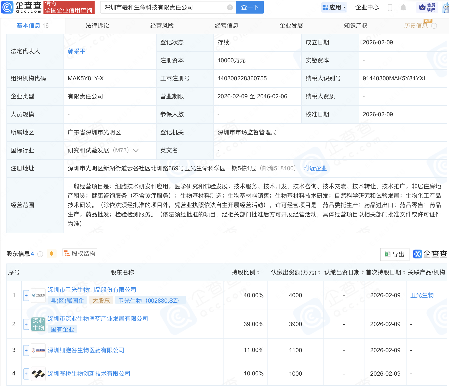 企查查APP显示,近日,深圳市羲和生命科技有限责任公司成立,注册资本1亿元,经营范围包含:细胞技术研发和应用;医学研究和试验发展;生物基材料制造;生物基材料销售;生物基材料技术研发等。企查查股权穿透显示,该公司由卫光生物(002880)等共同持股。