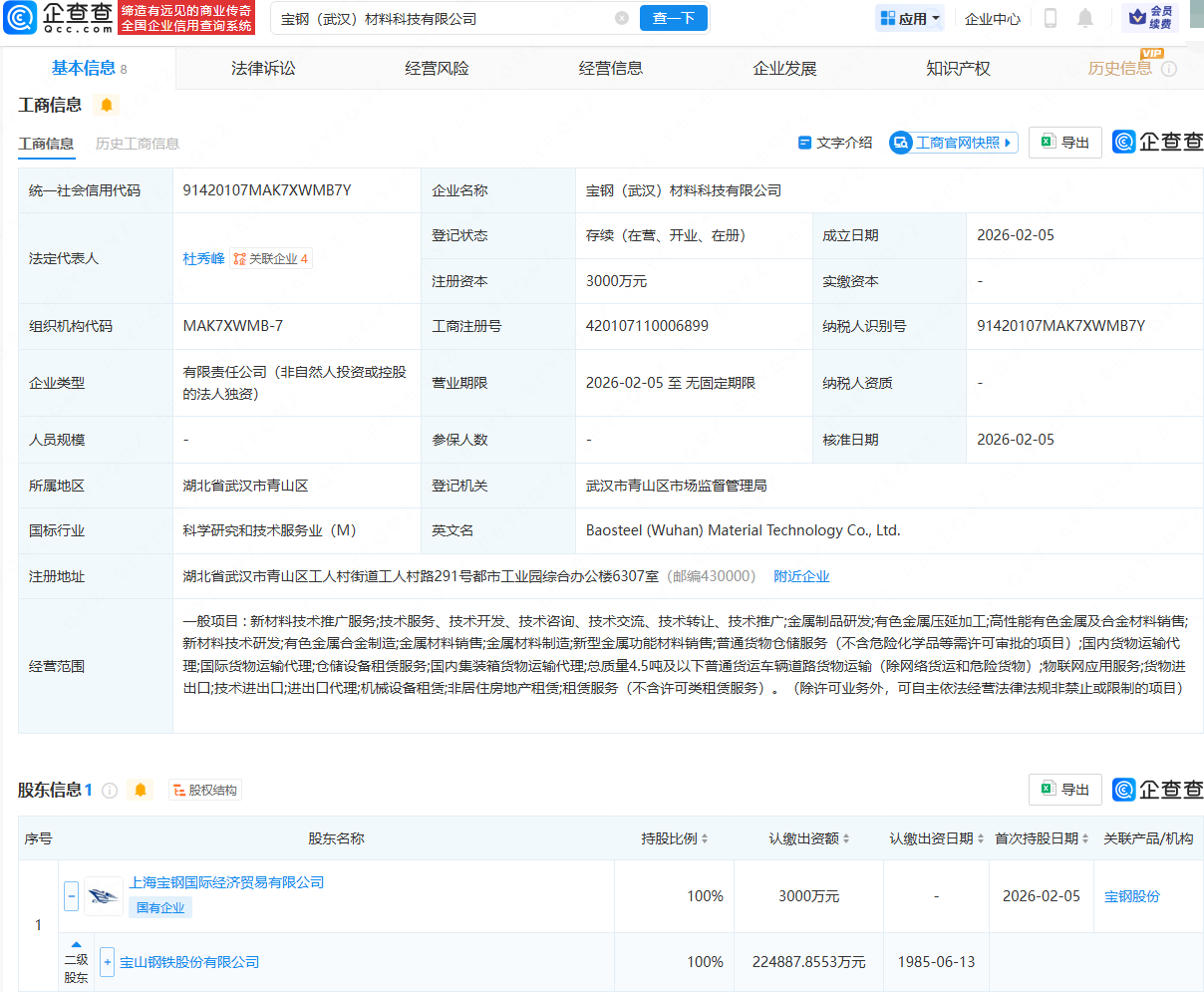 企查查APP显示,近日,宝钢(武汉)材料科技有限公司成立,法定代表人为杜秀峰,注册资本为3000万元,经营范围包含:新材料技术推广服务;金属制品研发;有色金属压延加工;新材料技术研发;有色金属合金制造等。企查查股权穿透显示,该公司由宝钢股份(600019)间接全资持股。