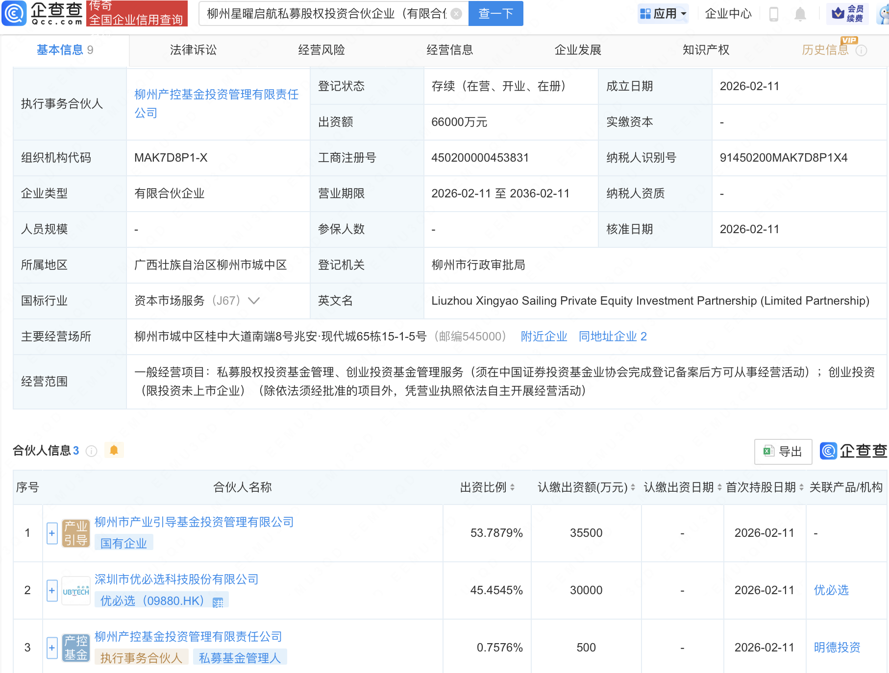 企查查APP显示,近日,柳州星曜启航私募股权投资合伙企业(有限合伙)成立,出资额6.6亿元,经营范围包含:私募股权投资基金管理、创业投资基金管理服务;创业投资(限投资未上市企业)。企查查股权穿透显示,该企业由优必选(09880.HK)等共同出资。