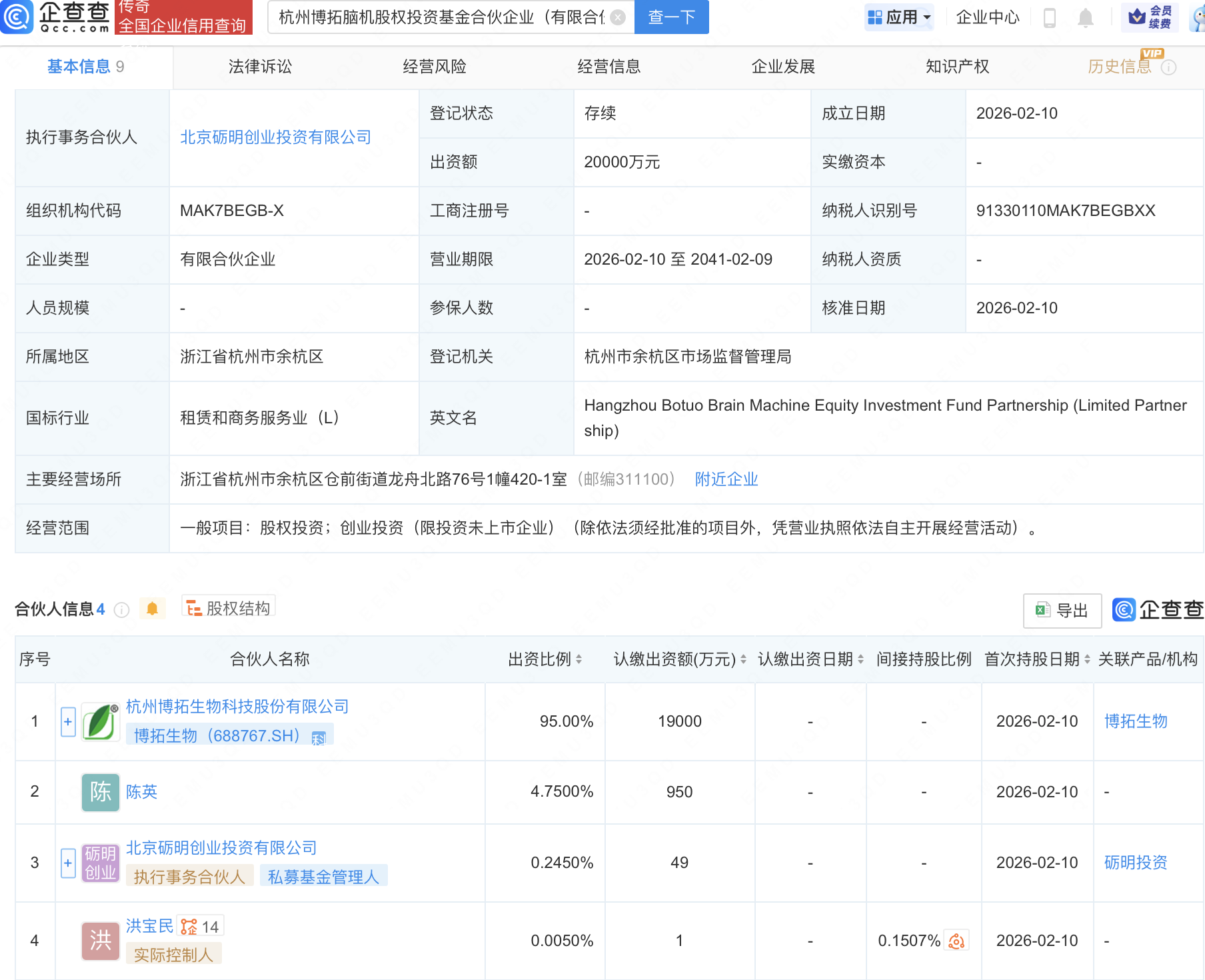 企查查APP显示,近日,杭州博拓脑机股权投资基金合伙企业(有限合伙)成立,出资额2亿元,经营范围包含:股权投资;创业投资(限投资未上市企业)。企查查股权穿透显示,该企业由博拓生物(688767)等共同出资。
