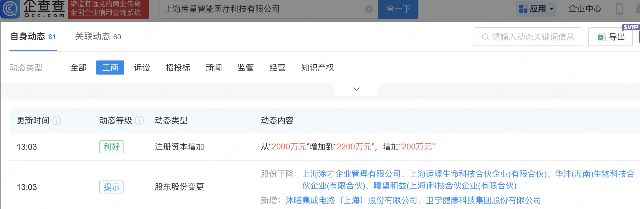 企查查APP显示,近日,上海库量智能医疗科技有限公司发生工商变更,新增沐曦股份(688802)、卫宁健康(300253)为股东,同时注册资本增至2200万元。企查查信息显示,该公司成立于2020年,经营范围包含:人工智能基础资源与技术平台;人工智能应用软件开发;人工智能行业应用系统集成服务;人工智能理论与算法软件开发等。
