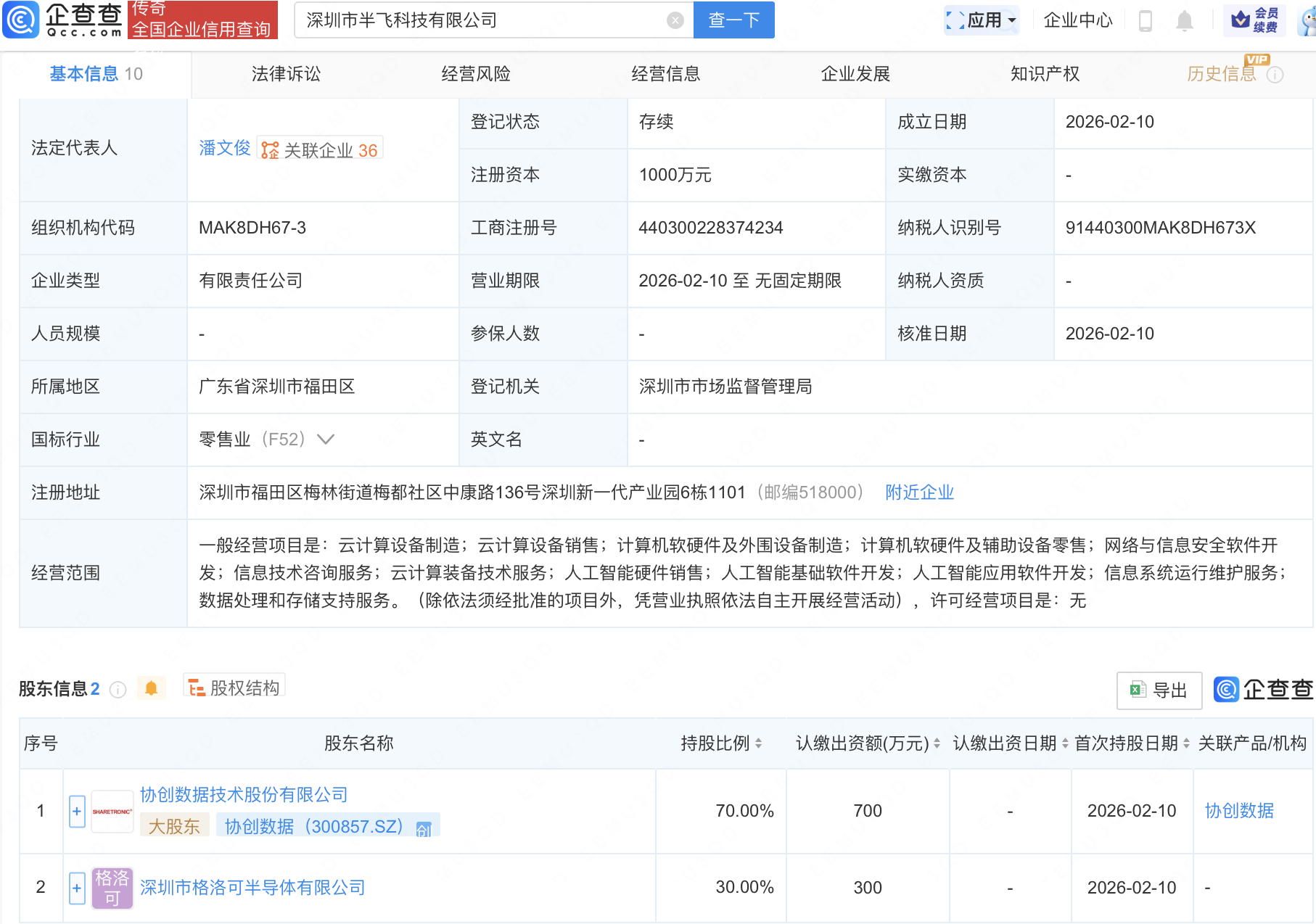 企查查APP显示,近日,深圳市半飞科技有限公司成立,注册资本1000万元,经营范围包含:云计算装备技术服务;人工智能硬件销售;人工智能基础软件开发;人工智能应用软件开发等。企查查股权穿透显示,该公司由协创数据(300857)等共同持股。
