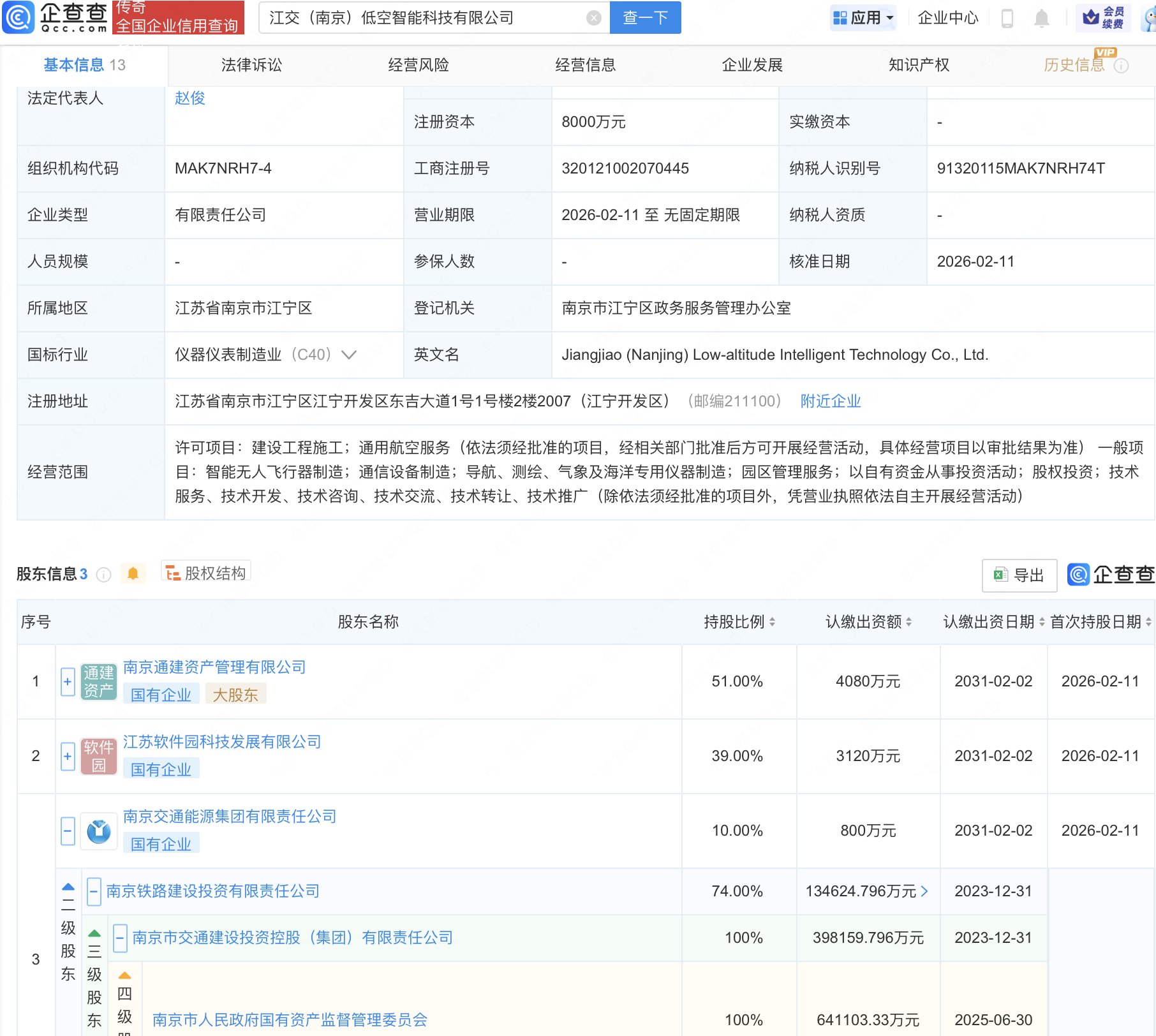 企查查APP显示,近日,江交(南京)低空智能科技有限公司成立,注册资本8000万元,经营范围包含:智能无人飞行器制造;通信设备制造;导航、测绘、气象及海洋专用仪器制造等。企查查股权穿透显示,该公司由南京交通能源集团有限责任公司等共同持股。