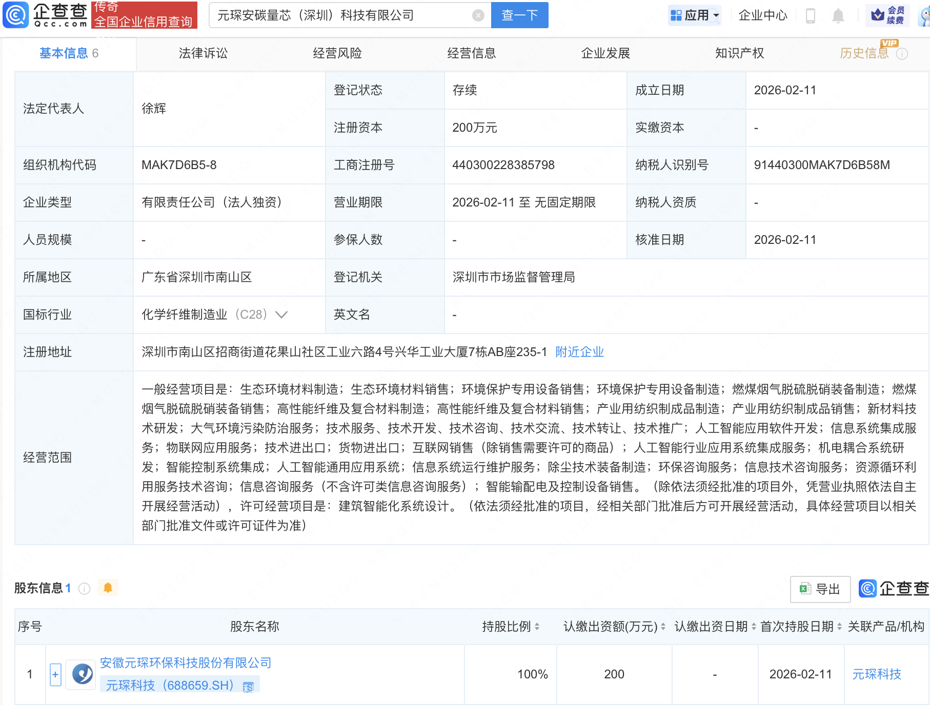 企查查APP显示,近日,元琛安碳量芯(深圳)科技有限公司成立,经营范围包含:人工智能应用软件开发;人工智能行业应用系统集成服务;人工智能通用应用系统等。企查查股权穿透显示,该公司由元琛科技(688659)全资持股。