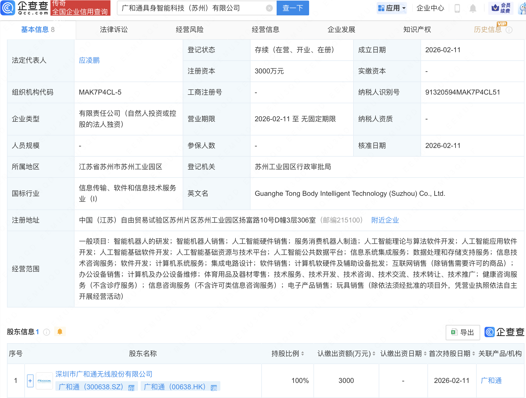 企查查APP显示,近日,广和通具身智能科技(苏州)有限公司成立,注册资本3000万元,经营范围包含:智能机器人的研发;智能机器人销售;人工智能硬件销售;服务消费机器人制造;人工智能理论与算法软件开发等。企查查股权穿透显示,该公司由广和通(300638)全资持股。