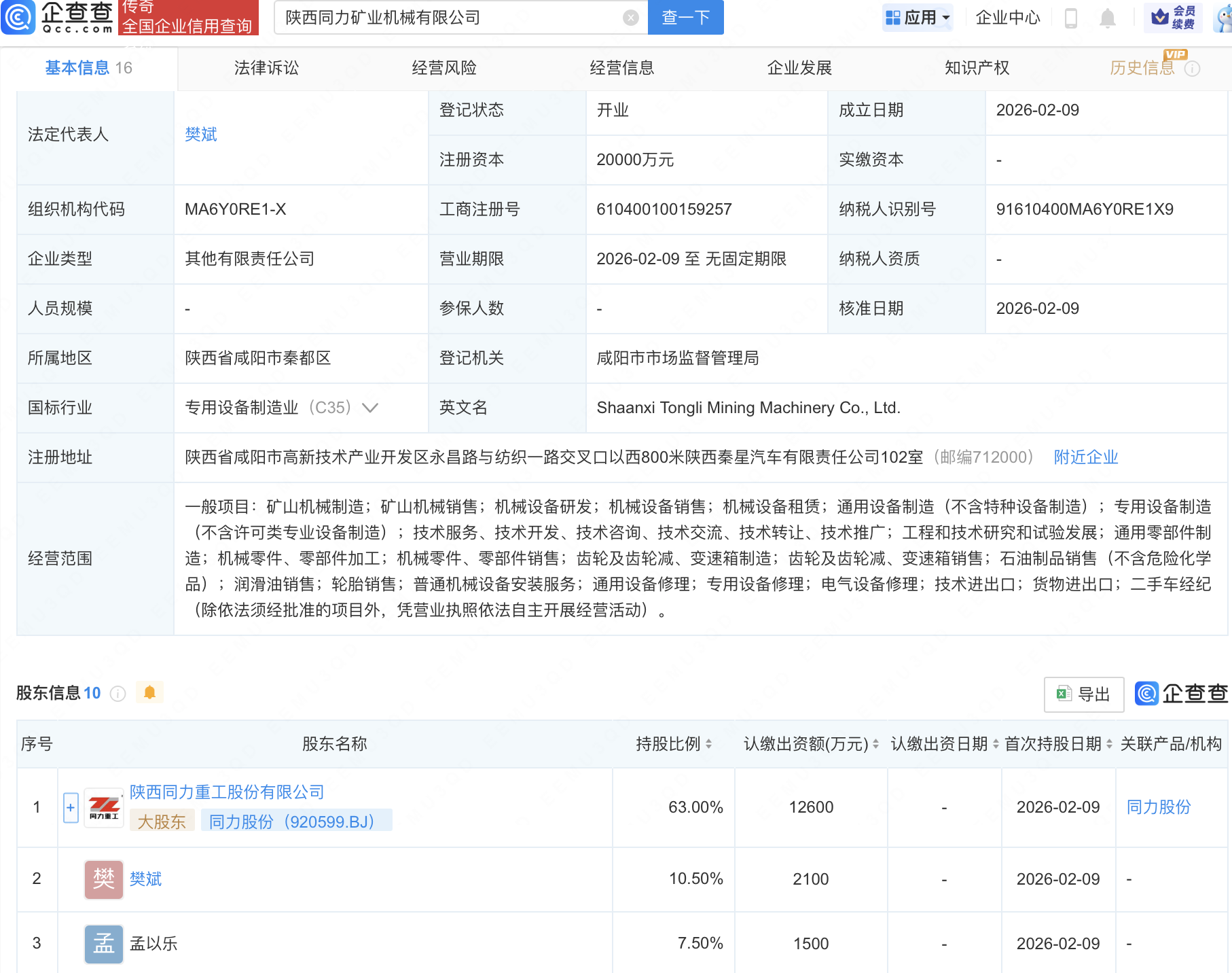 企查查APP显示,近日,陕西同力矿业机械有限公司成立,注册资本2亿元,经营范围包含:矿山机械制造;矿山机械销售;机械设备研发;机械设备销售;机械设备租赁等。企查查股权穿透显示,该公司由同力股份(920599)等共同持股。