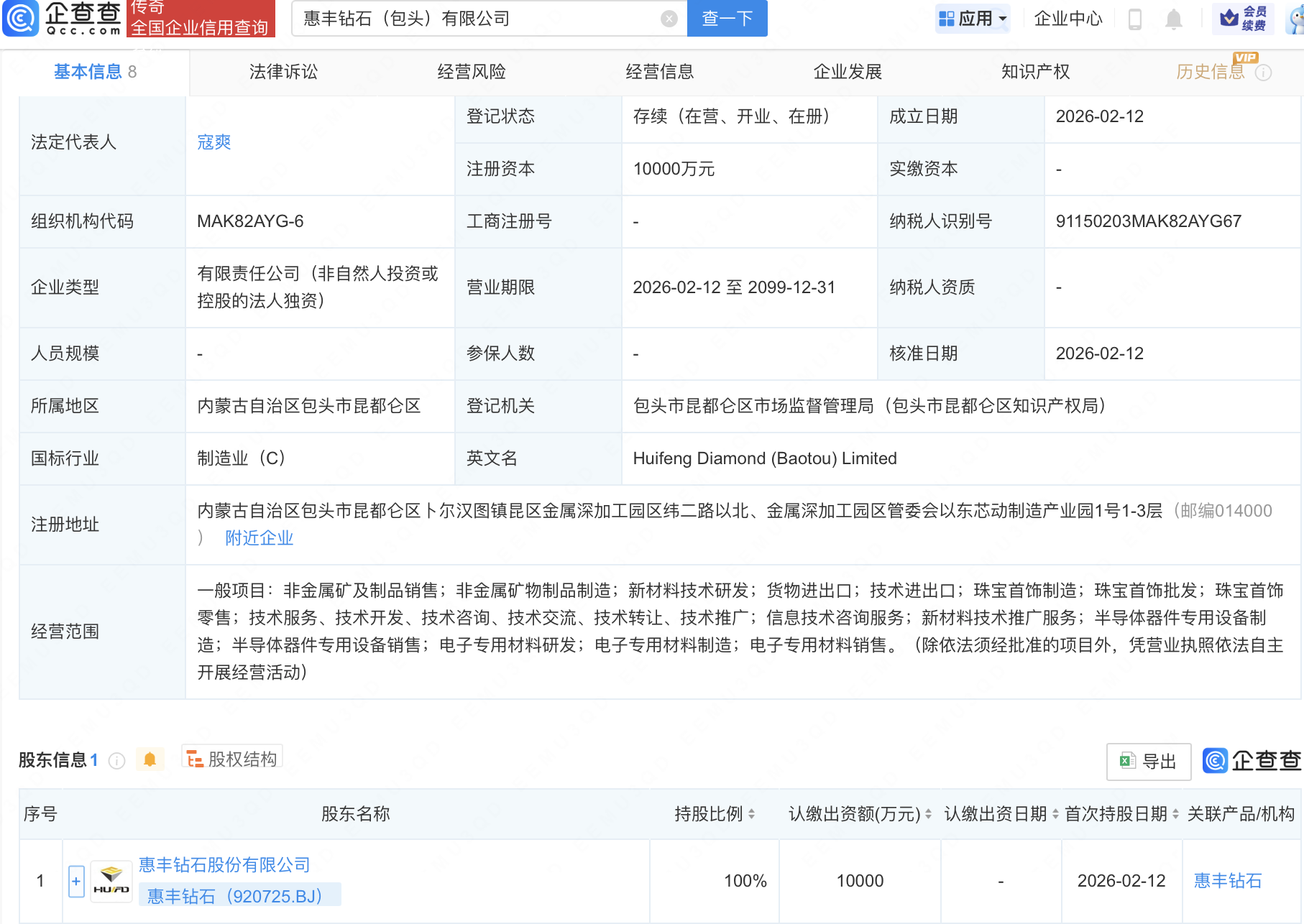 企查查APP显示,近日,惠丰钻石(包头)有限公司成立,注册资本1亿元,经营范围包含:半导体器件专用设备制造;半导体器件专用设备销售;电子专用材料研发;电子专用材料制造等。企查查股权穿透显示,该公司由惠丰钻石(920725)全资持股。