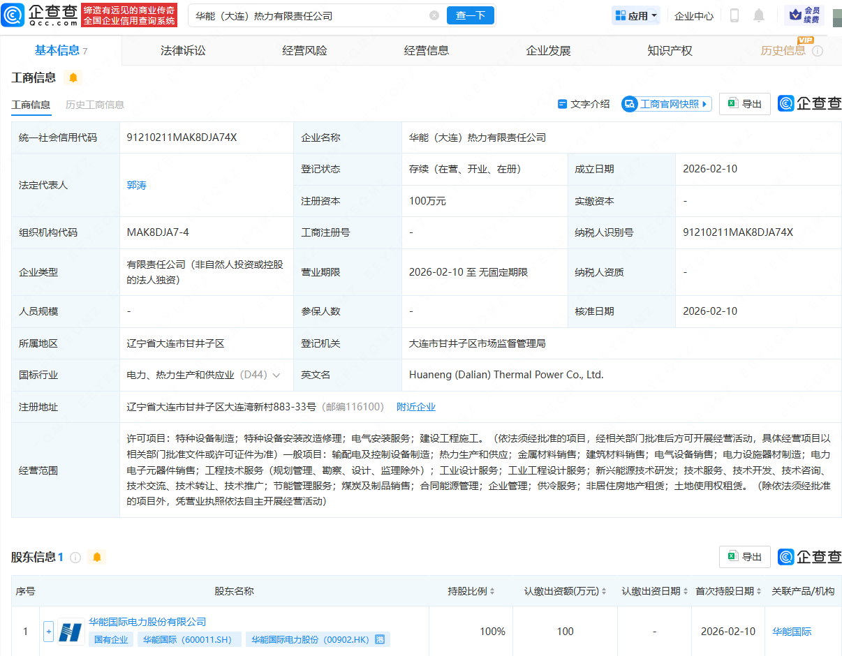 企查查APP显示,近日,华能(大连)热力有限责任公司成立,法定代表人为郭涛,经营范围包含:特种设备制造;特种设备安装改造修理;电气安装服务;热力生产和供应;金属材料销售等。企查查股权穿透显示,该公司由华能国际(600011)全资持股。